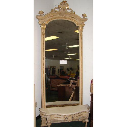 Beautiful tall over 8' high white with gilt mirror and marble base. Some damage on crest.