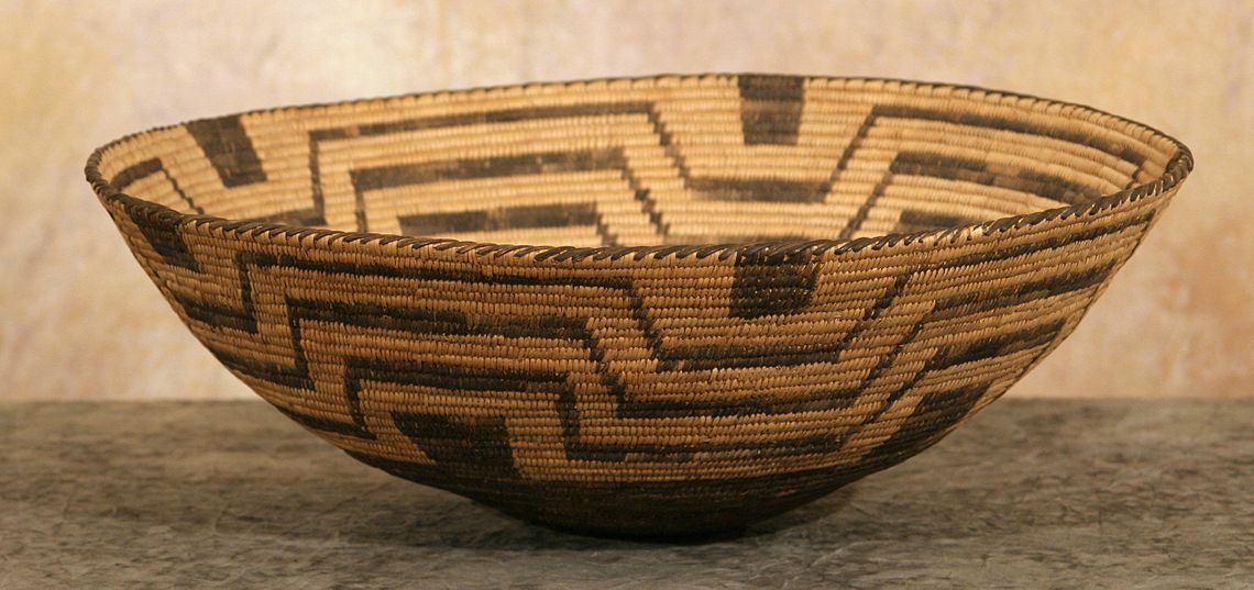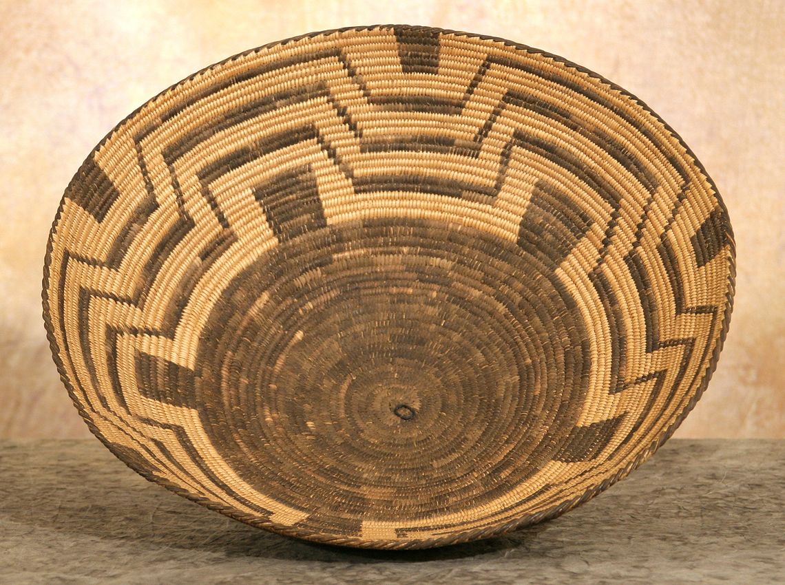 Large Pima Basket. 19" diameter x 6" depth, geometric designs. Circa 1920s. (est. $2,000-3,000). CONDITION REPORTS: www.auctioninsantafe.com/docs/cr2012.pdf