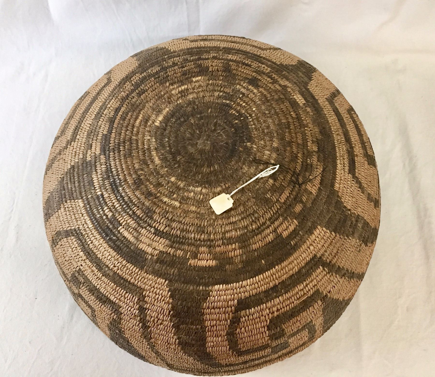 Description: Very large Pima basket. Maker: Unknown Pima weaver. Approx. Age: Circa early 1900s - 40s. Size: 21” w x 9” deep. Condition: Pretty good for its age, normal wear, fading, etc. expected. Please look closely at the pictures - they are an important part of our description. Shipping: There will be a $10 handling / packaging fee for shipping this lot. The actual cost of postage will be added on top of that.