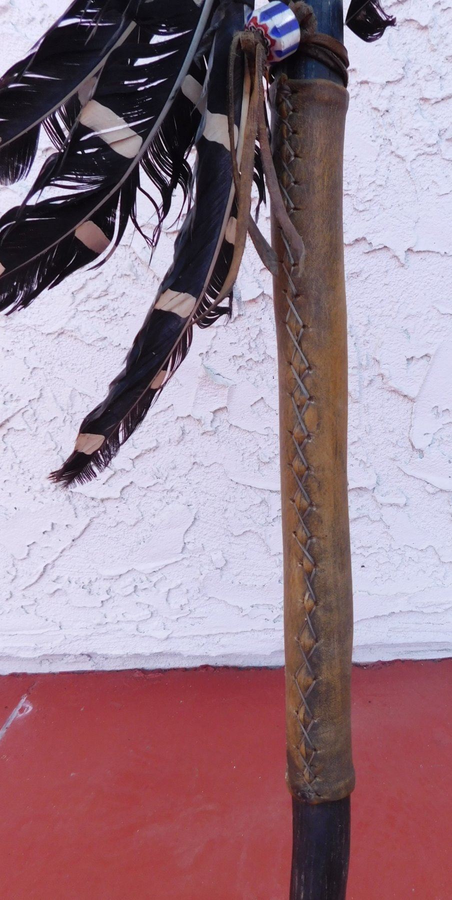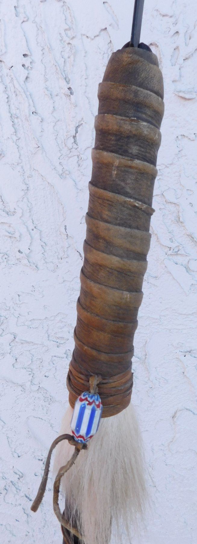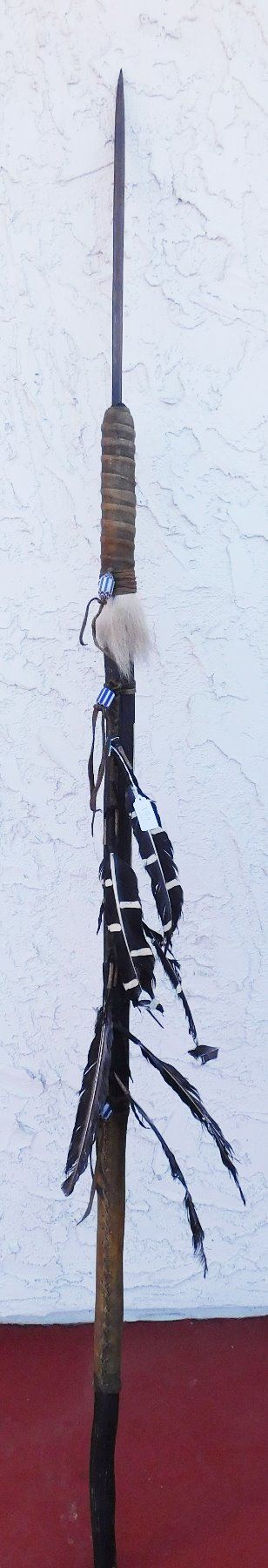 Large Plains Lance, 20th century item. Made of steel, rawhide, wood, beads, feathers. The item measures 75" x 2.5". Dakotas. Not a toy! Condition: Some wear, see images. Shipping: $65.00 USA estimate only, due to length, w/insurance and signature.