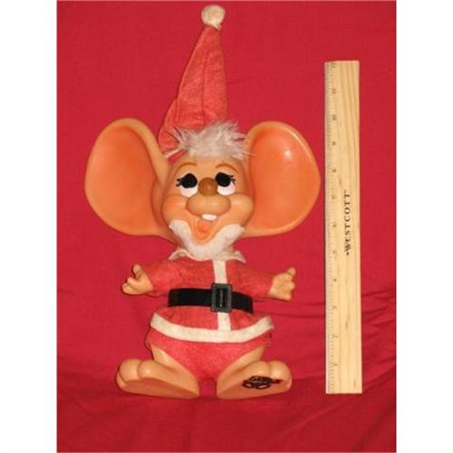 This is an unusual piece. It's a nice looking Santa Mouse seeming to be out of the 1950's era as its Christmas outfit looks to be from that period. It is a soft rubber and not hard at all. The mouse and clothing are generally in good condition as there are no holes or stains anywhere. This is a nice Christmas toy.