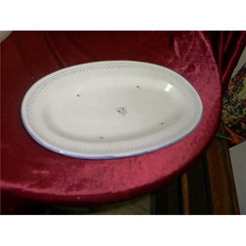 Large Platter Signed France. It is 16 1/2" Long and 9 1/2" Wide and kind of oblong. It is in perfect condition and signed from France and has the name and seal on bottom. It was not used, so it was for show only, as it has no wear on it at all. This one is just the right size for all the turkey goodies you put out on turkey day. A great add to your collection, and a very nice gift item to someone. Beautiful flowers and a blue dotted line and blue edge. Really a real nice one and would look great on any table it graces. Odd ball size makes it stand out, besides it's beauty. Hope you like it. Happy holidays to all.