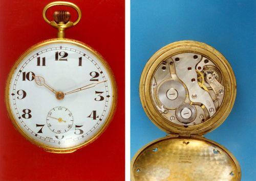 Grosse montre de poche en métal doré, signée DOXA, mouvement 8 jours à ancre, 15 rubis, Ø 69 mm, env. 1920