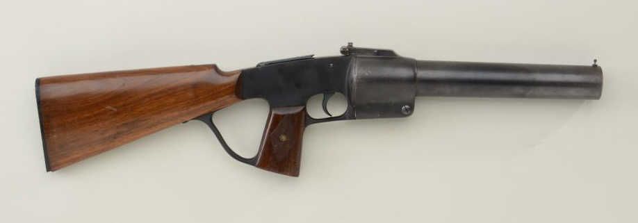 Large Police or Prison type gas gun by Federal Laboratories with 12” barrel and approx. 28” overall including wood stock; considerable muted blue finish remains, rough bore, good action and wood stock andcheckered grip; small chip missing from bottom toe of black plastic butt plate. Est.: $300-$600.