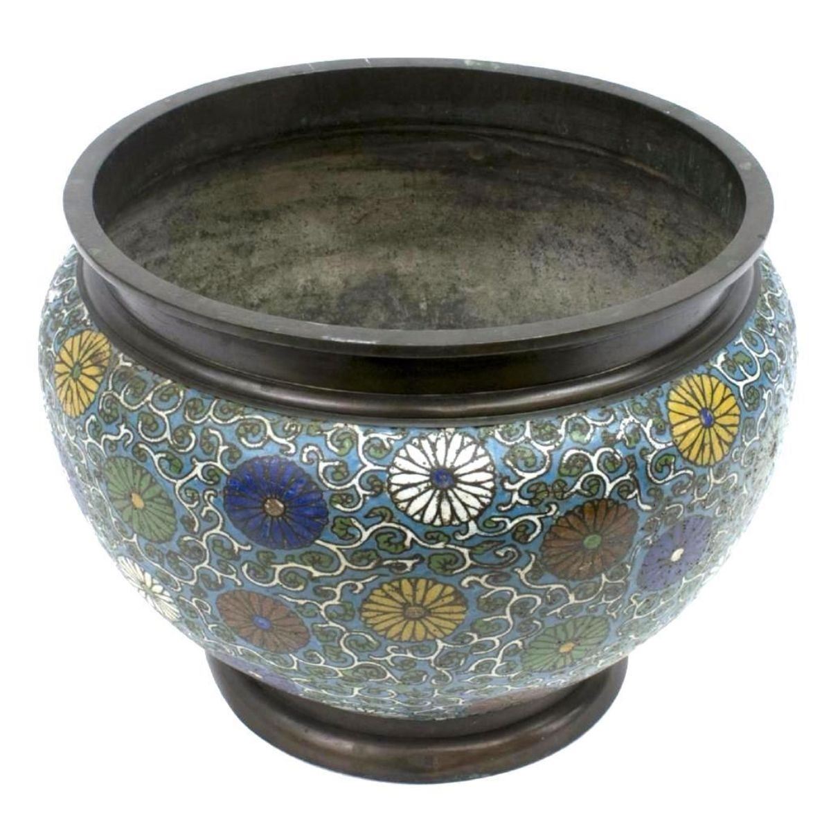 Large 20th Century cloisonne enamel jardiniere, withmetal rim & foot, center polychrome enamel flowers & tendrils. *** heavy pitting overall. Approx 10 1/2" H X 14" W.9lbs.