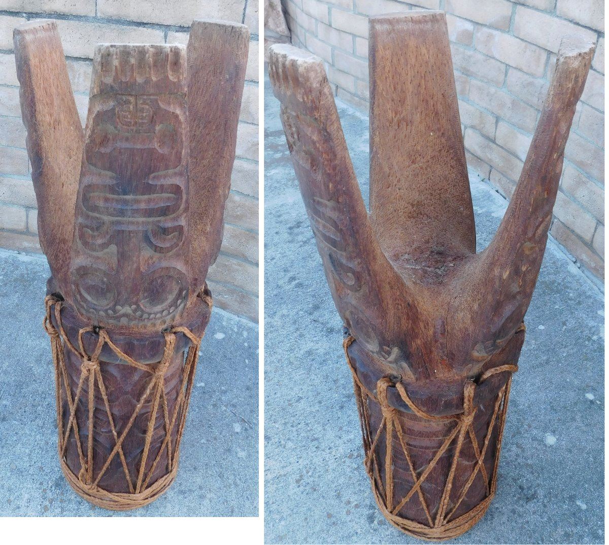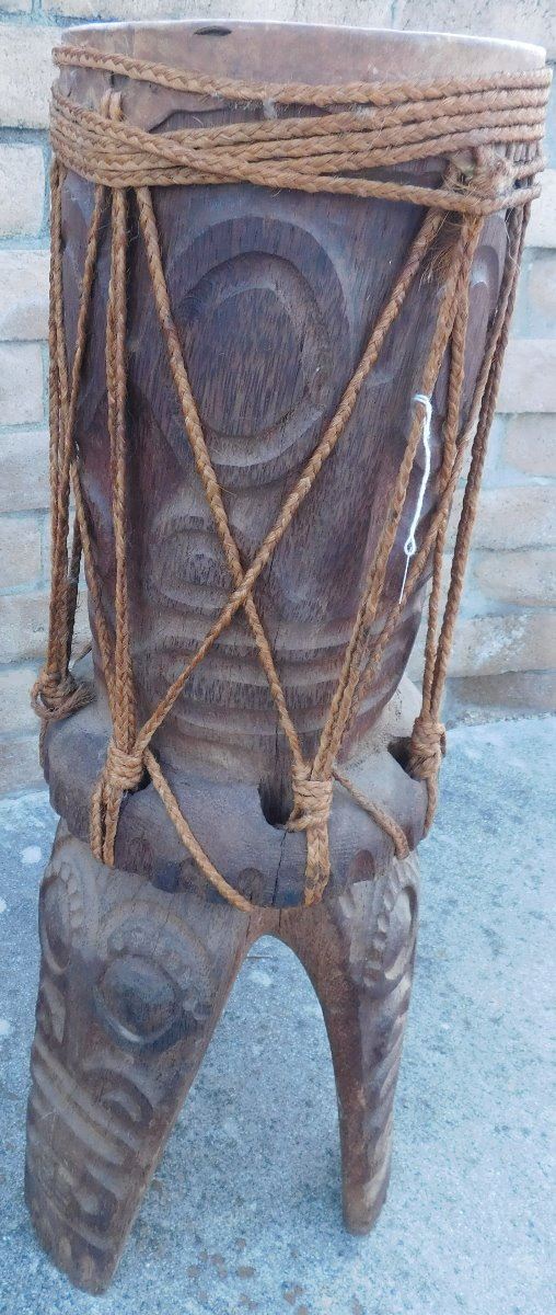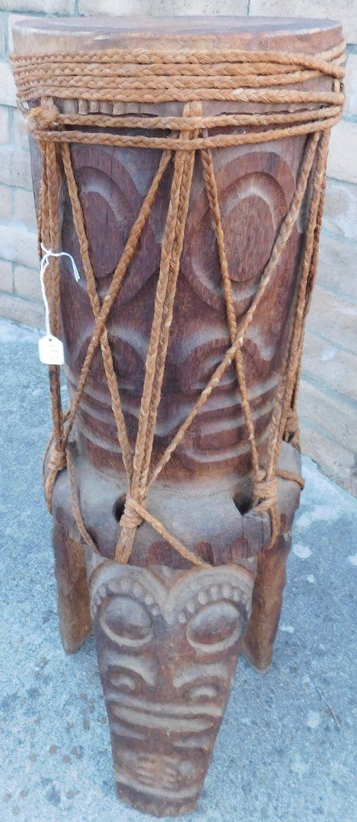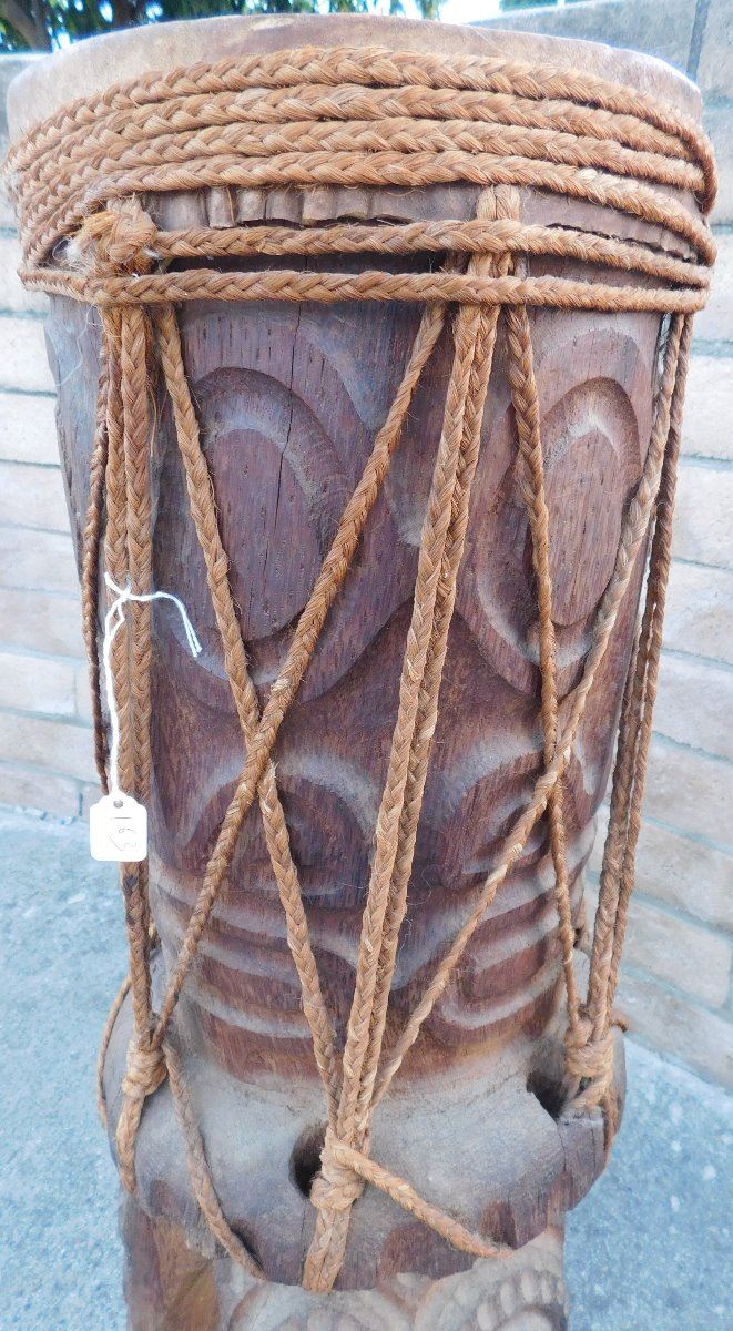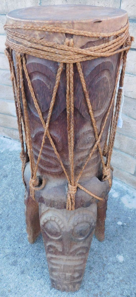 Large Polynesian Effigy Drum, circa WWII. Made of palm, wood and fiber, the item is 17.5" x 12.5" x 33", the drum on top is 10" x 10". Marquesas Islands. Human faces all over the drum, good sound! Ex. Maslyn Williams, author of Stone Age Island. Helm Certificate of Authenticity. Condition: Good, see images. Shipping: $120.00, USA estimate only, due to size and weight, w/insurance and signature. Auction house will not ship foreign; international buyers will be responsible for the export of this item.
