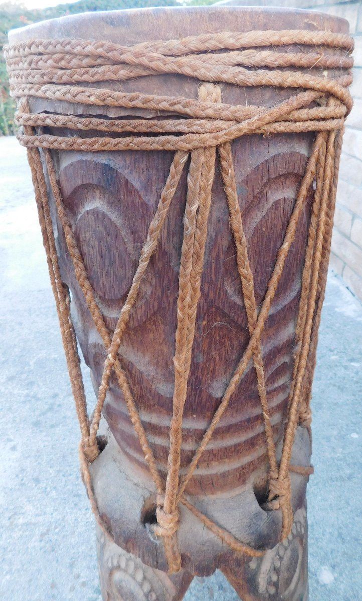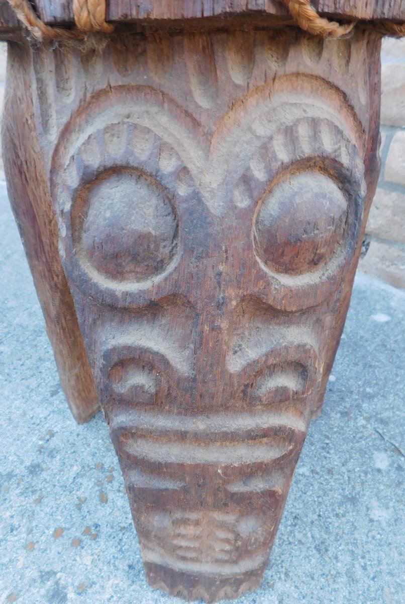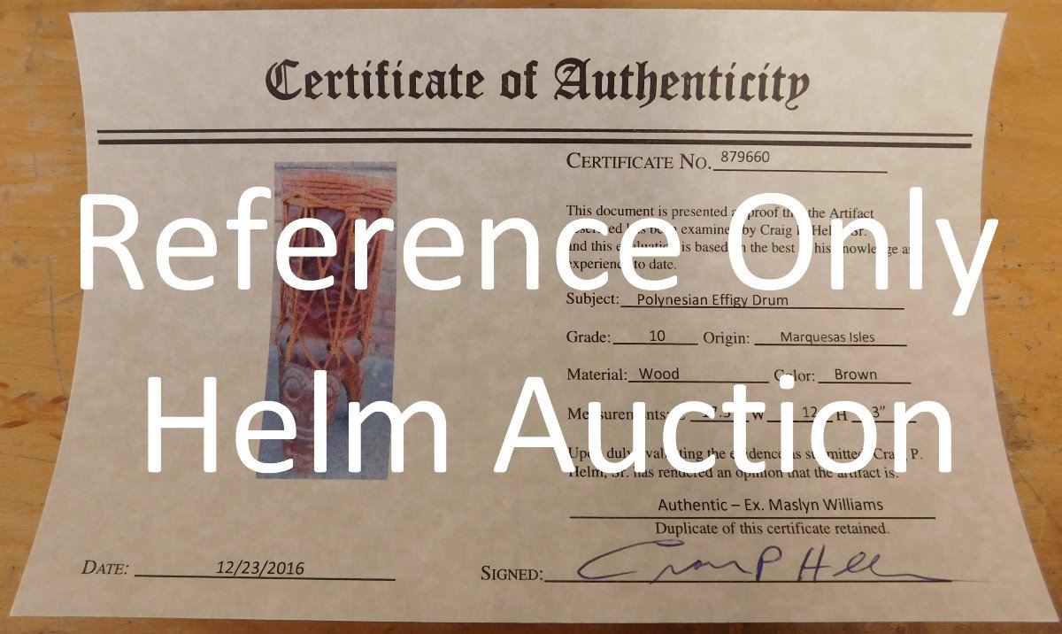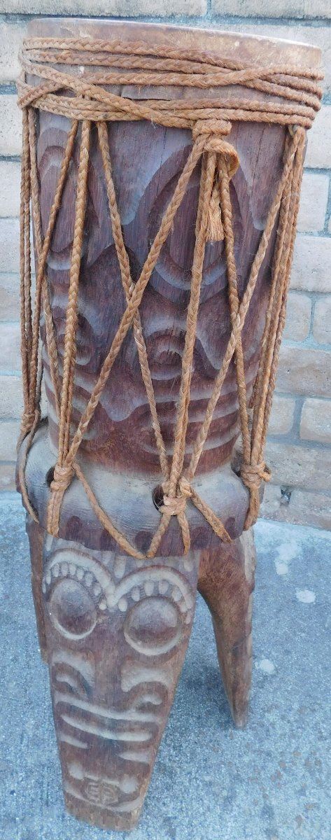 Large Polynesian Effigy Drum, circa WWII. Made of palm, wood and fiber, the item is 17.5" x 12.5" x 33", the drum on top is 10" x 10". Marquesas Islands. Human faces all over the drum, good sound! Ex. Maslyn Williams, author of Stone Age Island. Helm Certificate of Authenticity. Condition: Good, see images. Shipping: $120.00, USA estimate only, due to size and weight, w/insurance and signature. Auction house will not ship foreign; international buyers will be responsible for the export of this item.