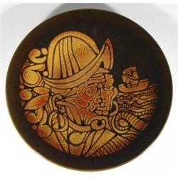 Large Poole pottery charger, decorated in browns with Harry Paye Pirate by Carolyn Wills, marks and signature to back, 41cm diameter