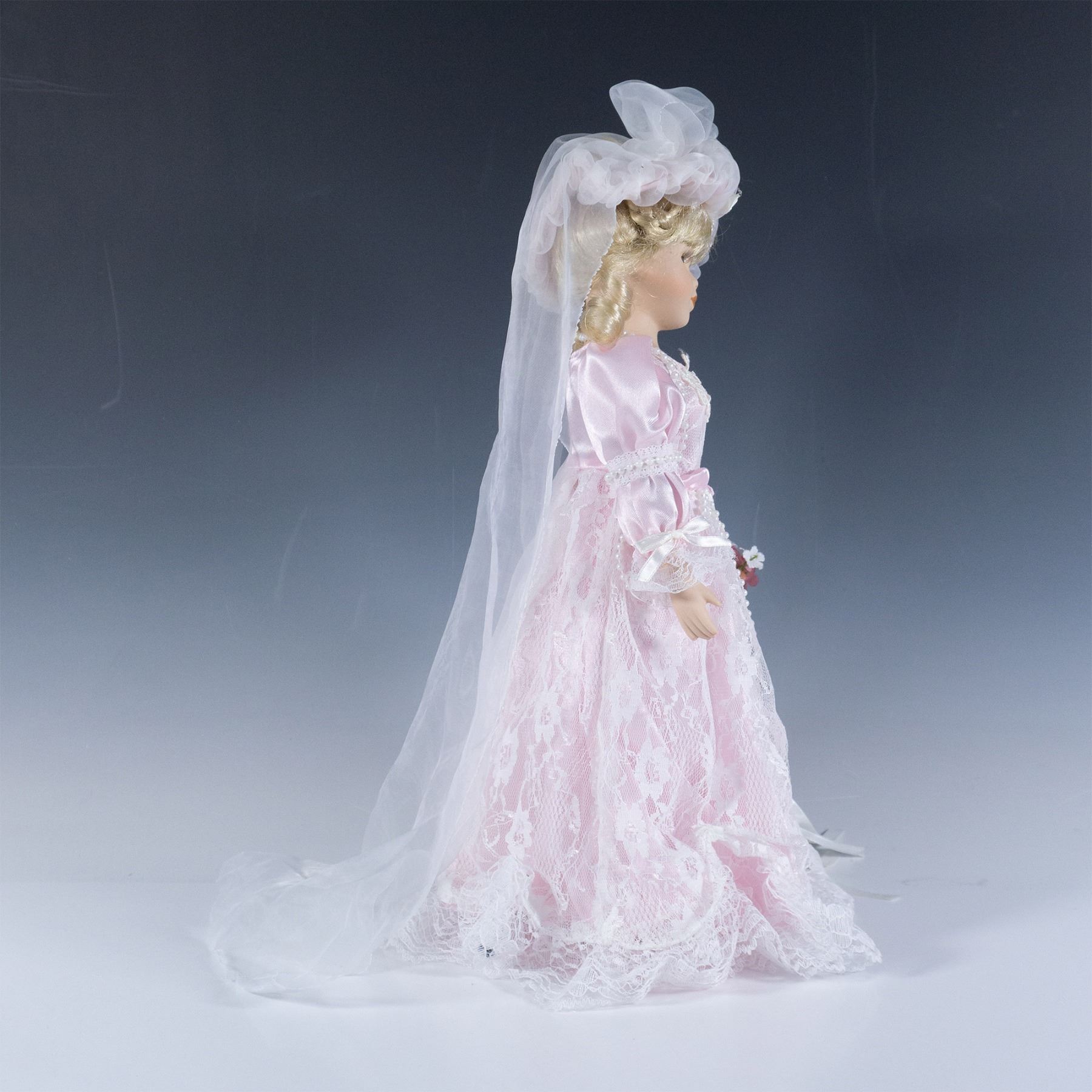 Tall blonde and blue eyed figure wearing a pink and lacy dress. Metal stand included.
