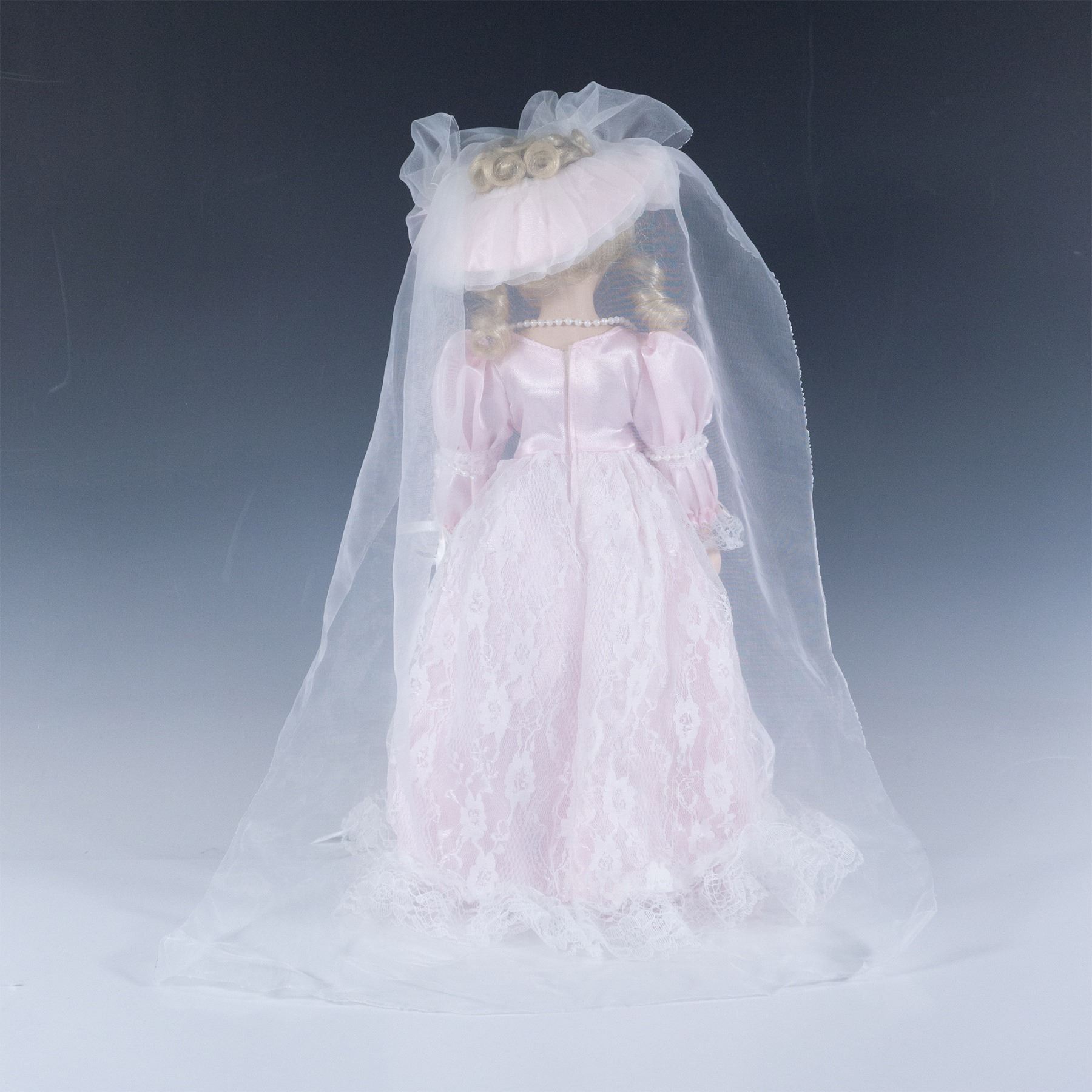 Tall blonde and blue eyed figure wearing a pink and lacy dress. Metal stand included.