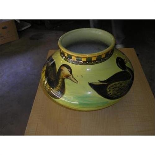 Large Porcelain Duck Vase. Very colorful and detailed really well. You can put this in with any duck collection you may have, just to set off your other duck items. It is all hand painted and glazed over. It is 8" H X 11" and base is 6". Really a unique one and has many uses. The colorful colors will get you as it is so attractive. Great add to any collection you may have and nice gift item to anyone who just loves Duck and Duck items. This is a real nice one and hope you like it. Will put up more photos.