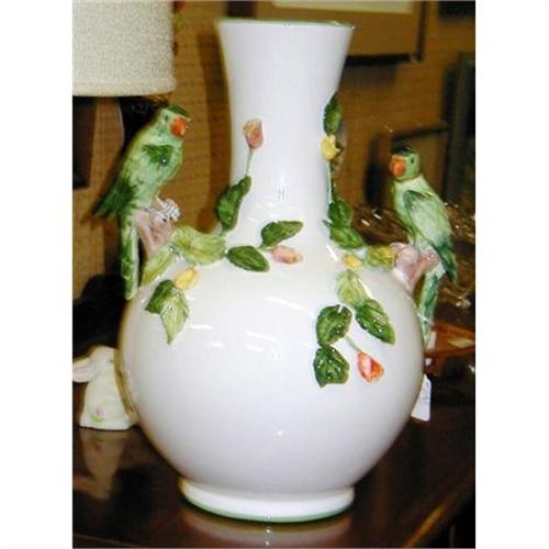 </font></strong>Extraordinary Large heavy white porcelain pottery vase with colorful parrot handles in green.  Also green leaves with pink buds in front.  Green trim on top rim and bottom.  Leaf has a tip missing, but it is not noticeable, few rough edges also.  Parrots are 6" high.  Buyer pays shipping and handling costs.</font>