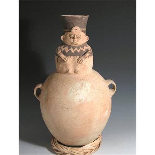 From northern Peru, dating ca. 1000 - 1400 A.D., with a plump human figure sitting on the vessel neck with low relief features, modeled arms and tiny feet projecting, acting as the spout, this painted dark brown on a cream ground, rounded base and twin strap handles. 18-1/2"H, appears choice, but has a bit of rim roughness repaired and two invisibly repaired probe holes. Ex- major New York auction house.