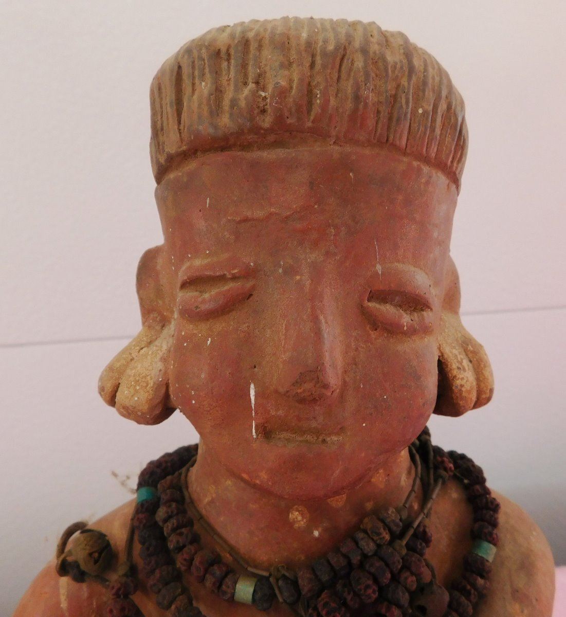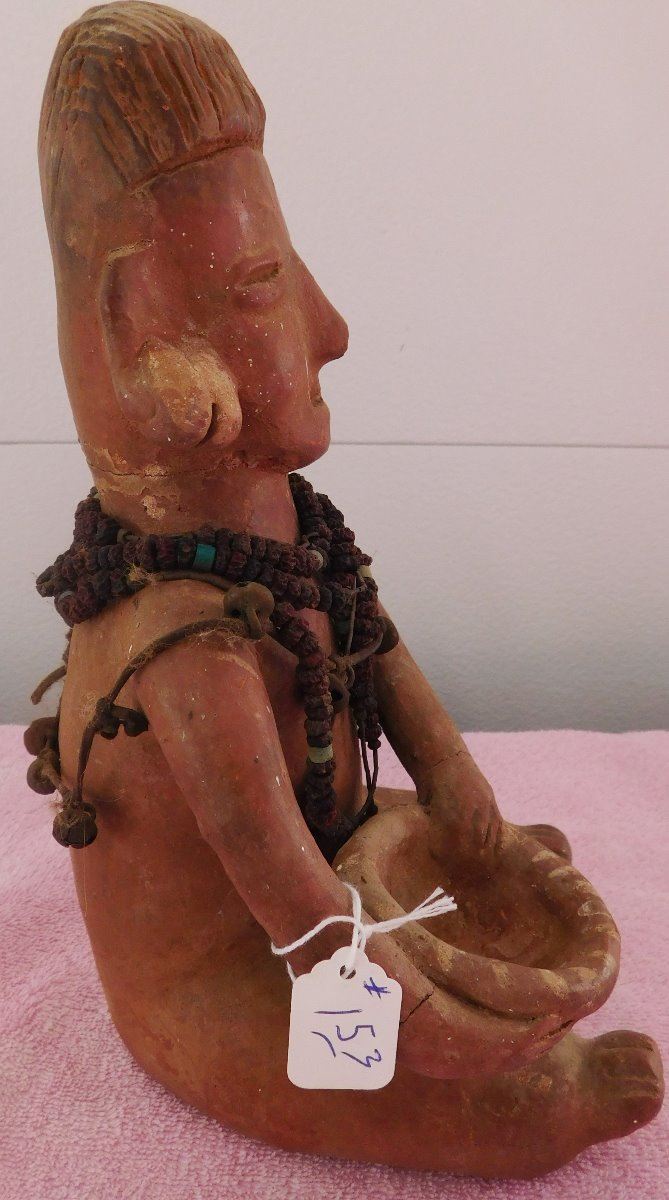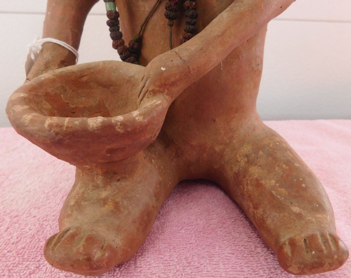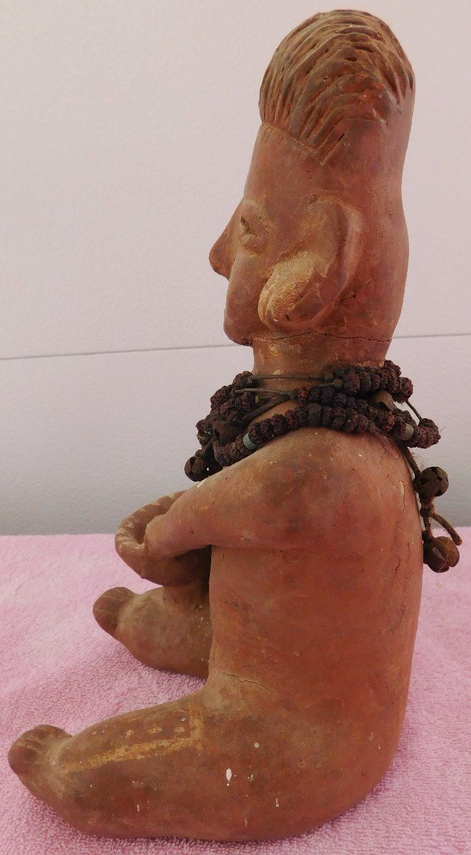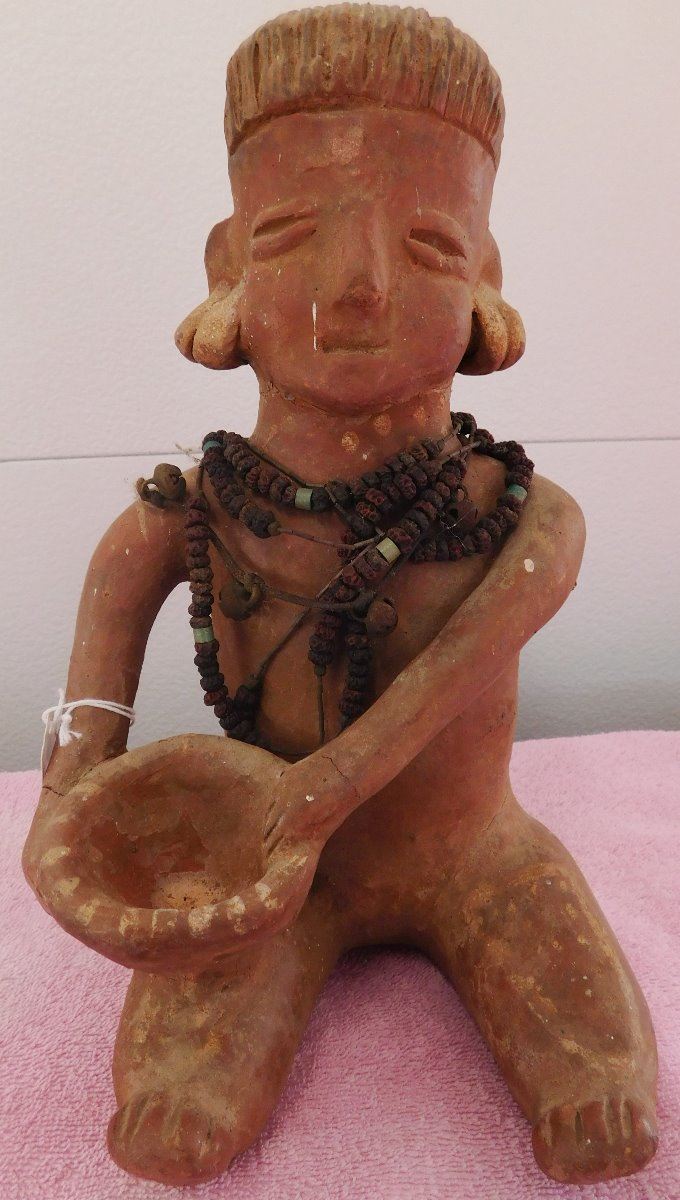 Large Pre-Columbian Figure, circa 1000 years old. Made of clay and measuring approx. 6" x 6" x 11. From Colima, Mexico. Beads appear to have been added later. Condition: Good, see images. Shipping: $35.00 w/insurance and signature, double-boxed.