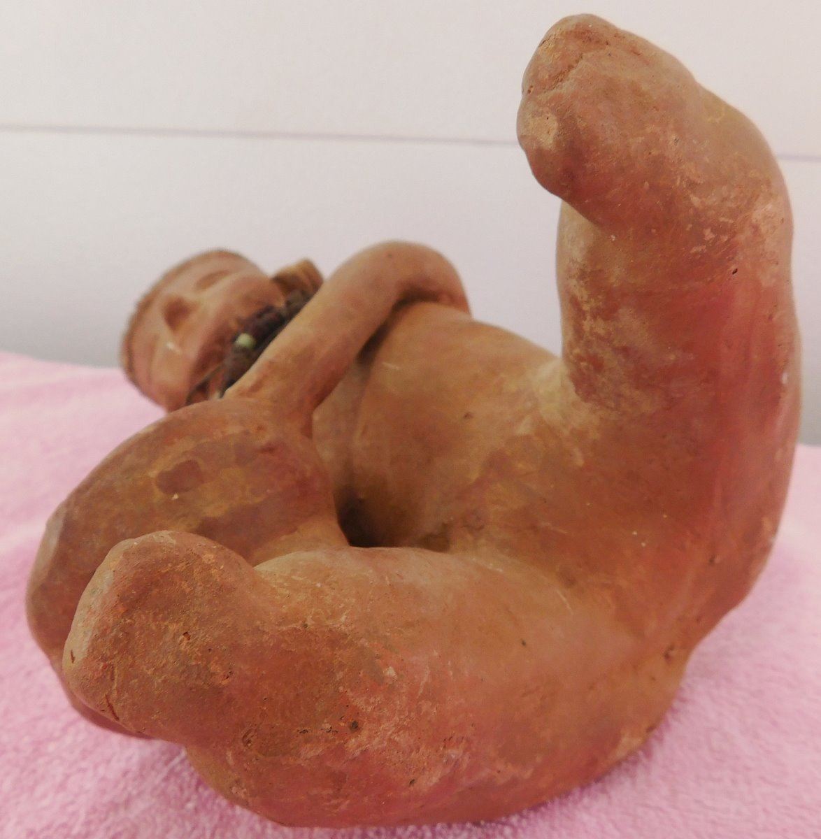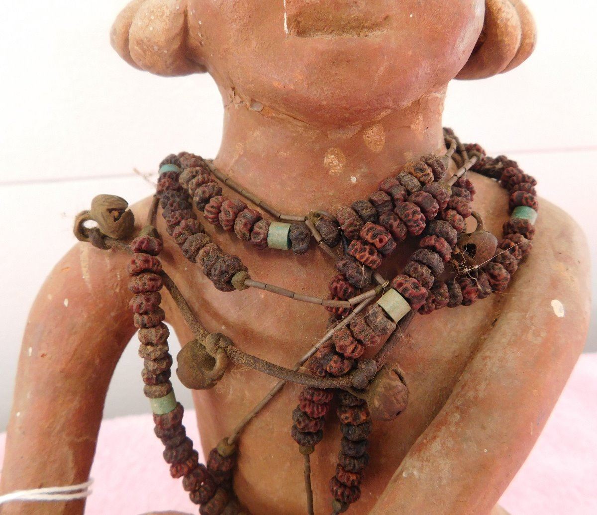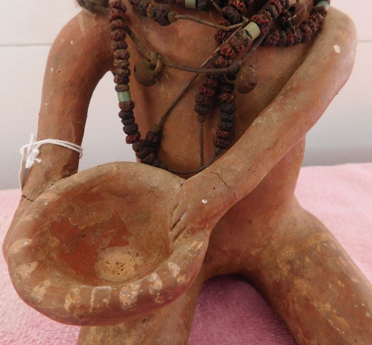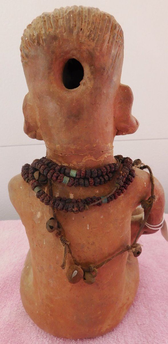 Large Pre-Columbian Figure, circa 1000 years old. Made of clay and measuring approx. 6" x 6" x 11. From Colima, Mexico. Beads appear to have been added later. Condition: Good, see images. Shipping: $35.00 w/insurance and signature, double-boxed.