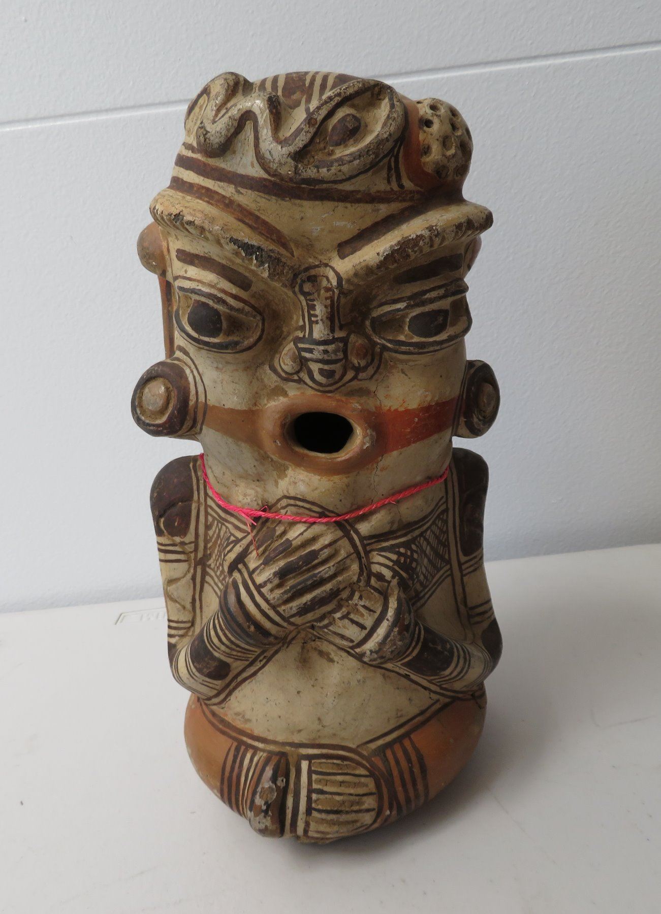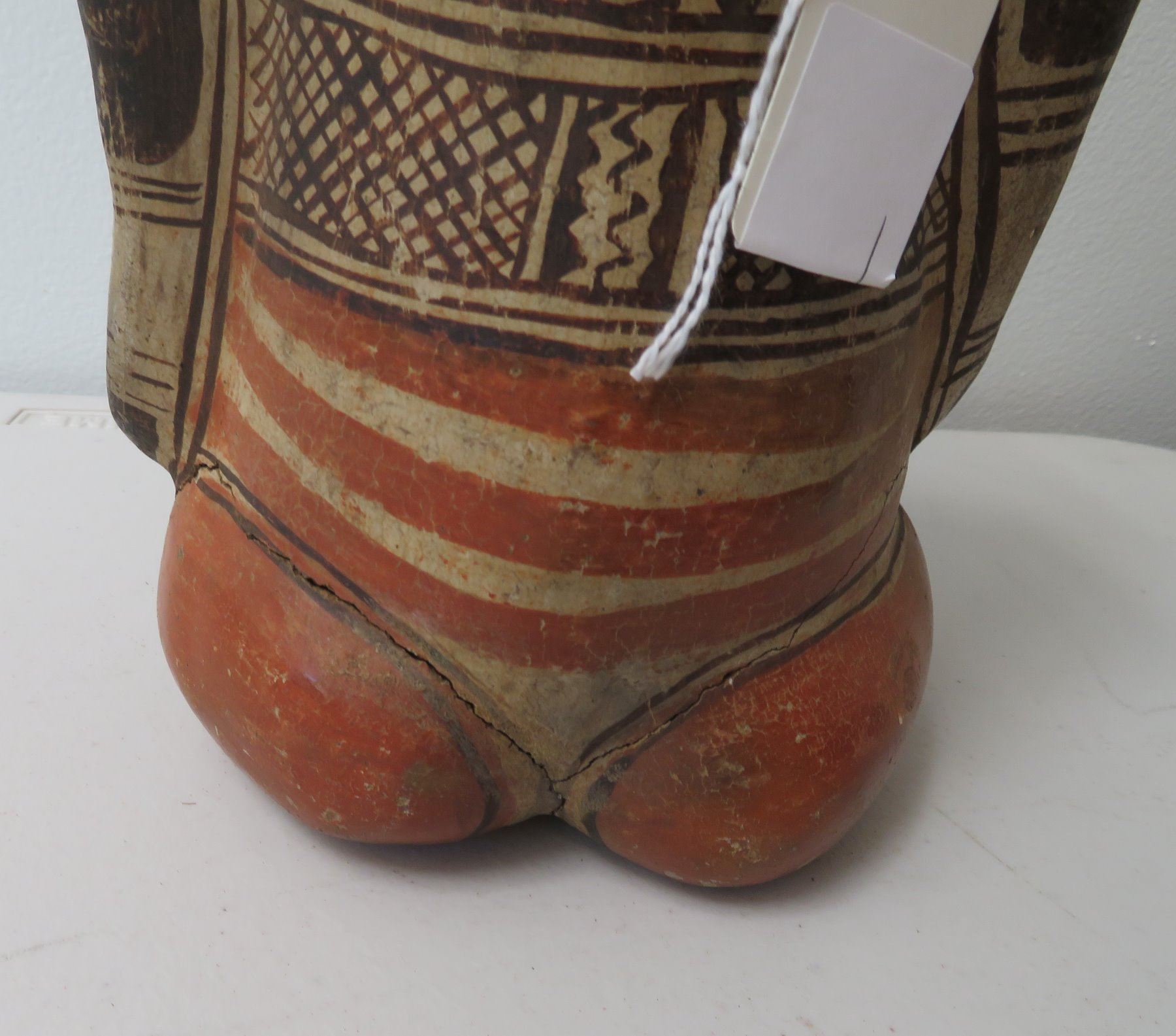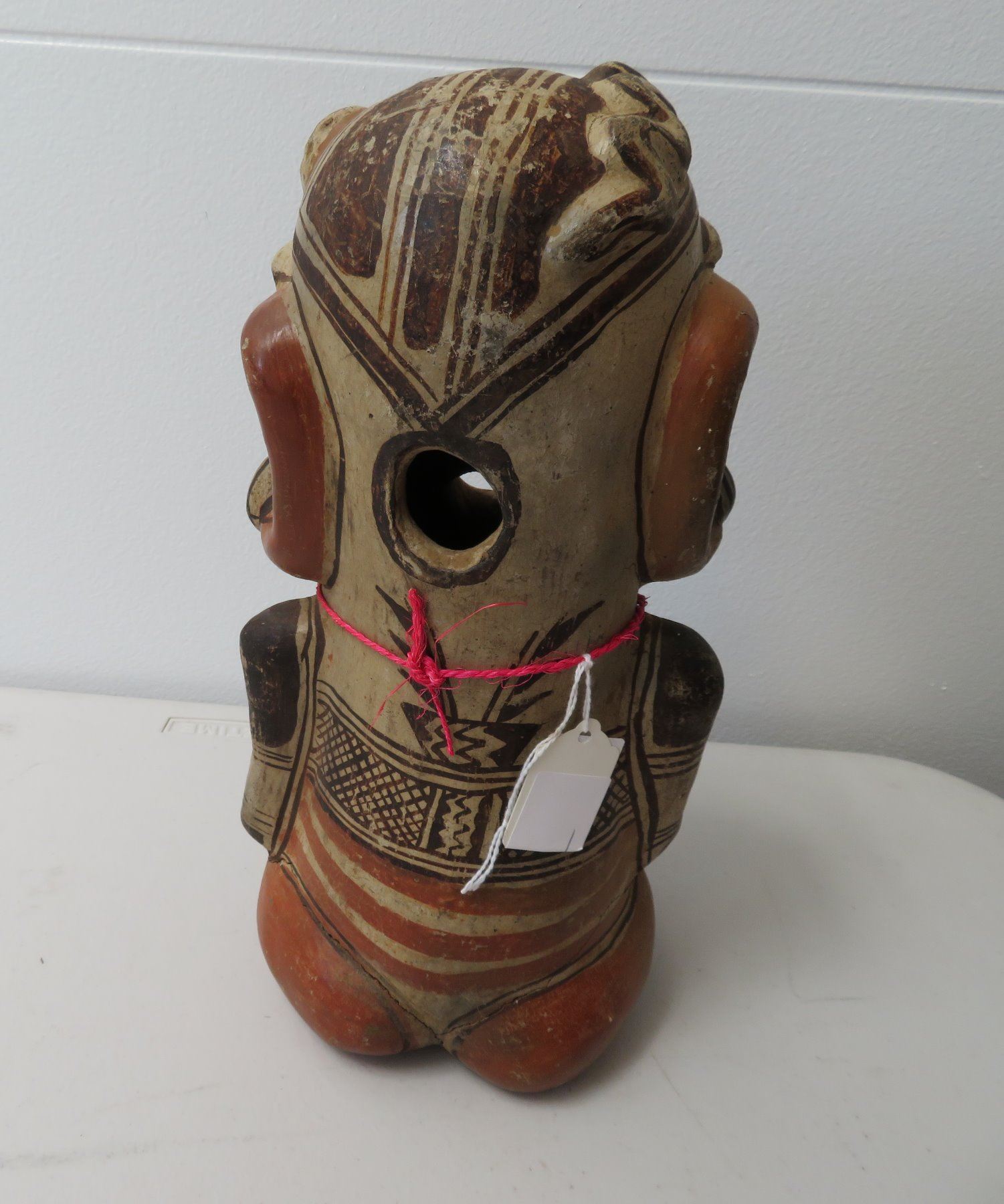 Large Pre-Columbian Figure, pre-Columbian item. Made of clay, the item measures 11" x 6" x 6". Costa Rica. Condition: Good, see images. Shipping: $42.50 w/insurance and signature, due to size and weight, double-boxed.