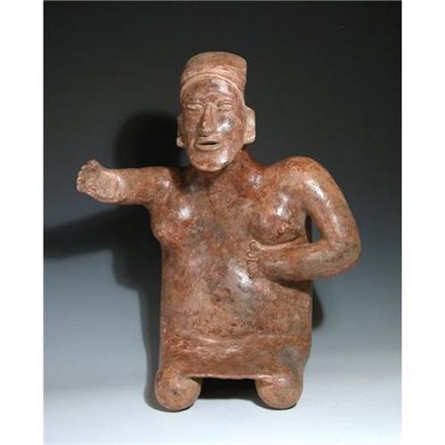 A huge and quite attractive terracotta seated female from the Jalisco culture of West Mexico. Dating between 300 B.C. and 100 A.D., this fine femme fatale looks like she is ready for a night of dancing on the town. Covered in deep brown slip and arms positioned as if she were doing the Latin Macarena, with short legs covered with a skirt, hair up under her turban and wearing the very fashionable earspools. 18"H x 14-1/4"W x 8-1/2"D, appears choice but has one arm almost invisibly reattached and possible repair to her back. Ex-private Santa Fe, NM Collection.