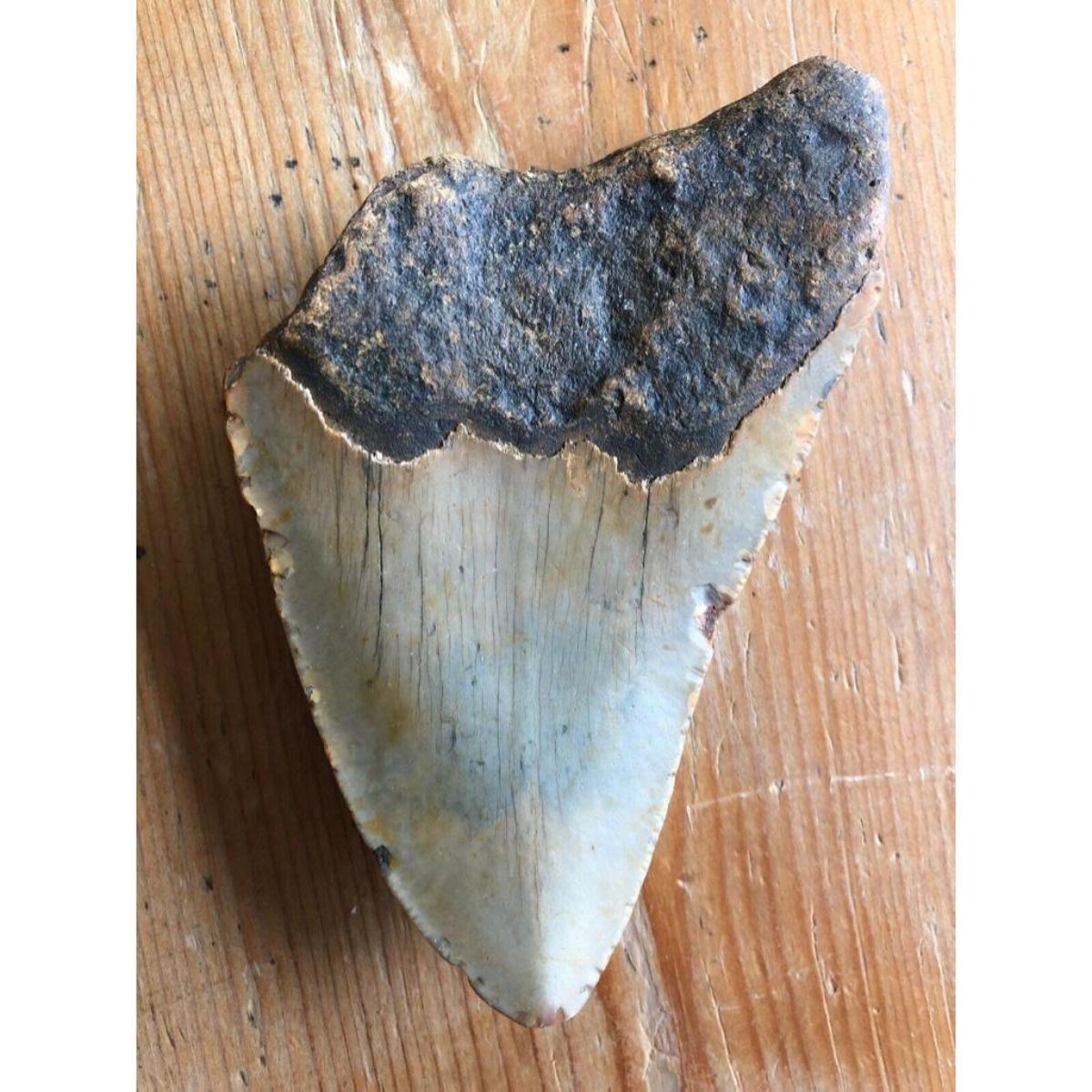 Large ( 4 1/2" L X 3" W ) Prehistoric Megalodon Shark's tooth, in natural, unrestored condition. Tooth with gum, dark brown/ rust with grey/ rust enamel. Recovered Deep Atlantic, Eastern Seaboard