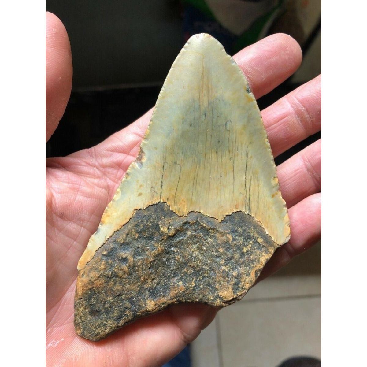 Large ( 4 1/2" L X 3" W ) Prehistoric Megalodon Shark's tooth, in natural, unrestored condition. Tooth with gum, dark brown/ rust with grey/ rust enamel. Recovered Deep Atlantic, Eastern Seaboard