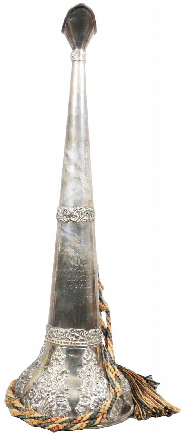 Large Presentation Firemen's Trumpet. Presented to "Cataract Engine No 8", M. Holmes Fireman, a token of regard from their friend, L.H. Everill Nov. 22nd 1858. Heavy repouse detail, silver plated and original braid and tassels. Excellent condition. 24 3/4 inches tall, with 8 inch diameter bell.