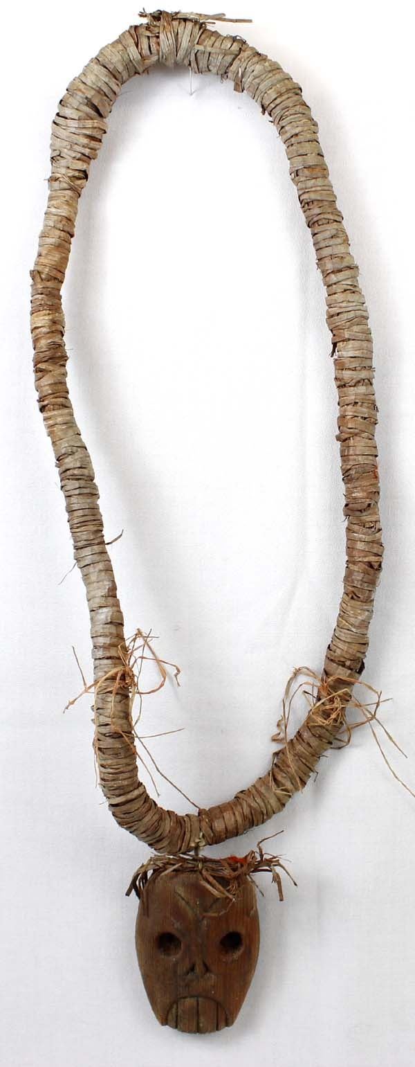 Large Primitive Tarahumara Carved Mask Pendant Necklace, measures 36''L end to end, mask pendant measures 3'' x 5''