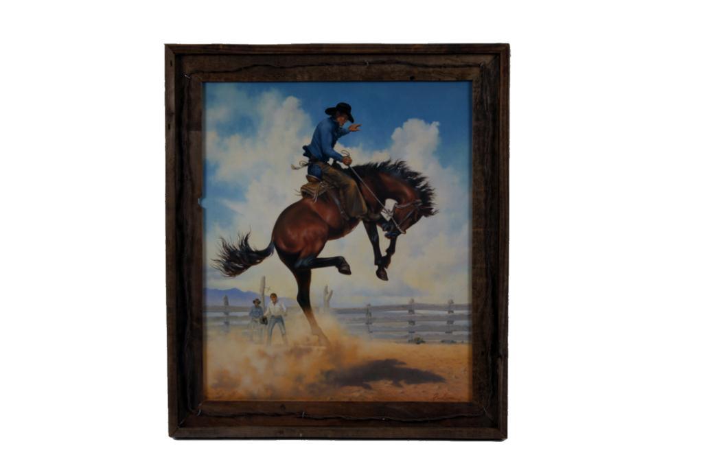 Large Print by Fred Lucas Depicting a rodeo bronc rider, entitled "Stay With Him, Bill!". Barn wood