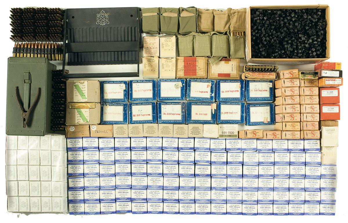 Large quantity of rifle cartridges produced by various manufactures. Includes 6.5 Japanese, 8 mm, .30-06, but mostly 7.62x39mm. With numerous machine gun cartridge links and Ohio Ordnance Works linker/delinker