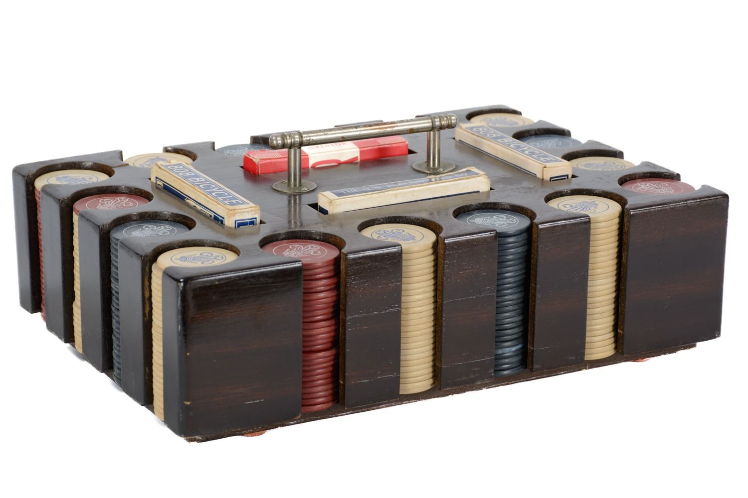 A full 400 chip rack with red, white and blue fleur-de-lis composite chips and 4 decks of cards. 12" x 8 1/2" x 4 1/4" with an extendable nickel handle.