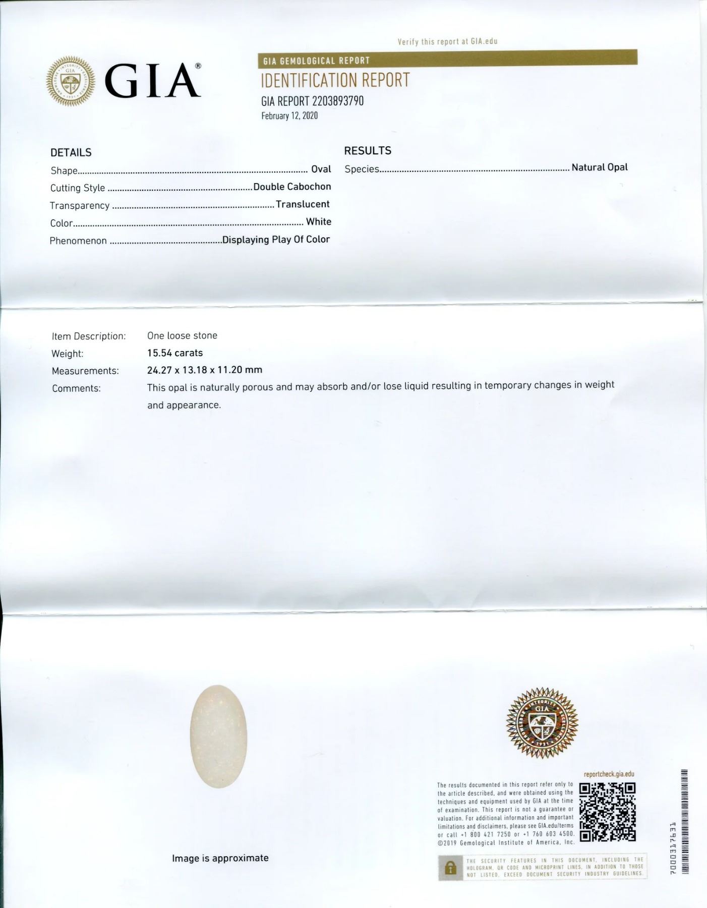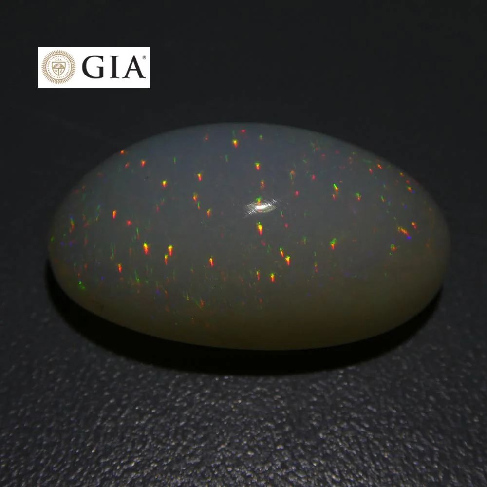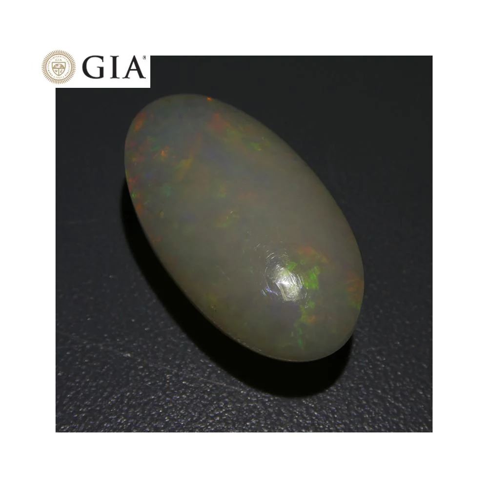 This breathtaking 15.54 Ct White Opal measures 24.27 x 13.18 x 11.20 mm with a double cabochon oval cut. Displays a play of colors and would be a great addition to any collection! Origin: Ethiopia. Please see the certification for additional information.