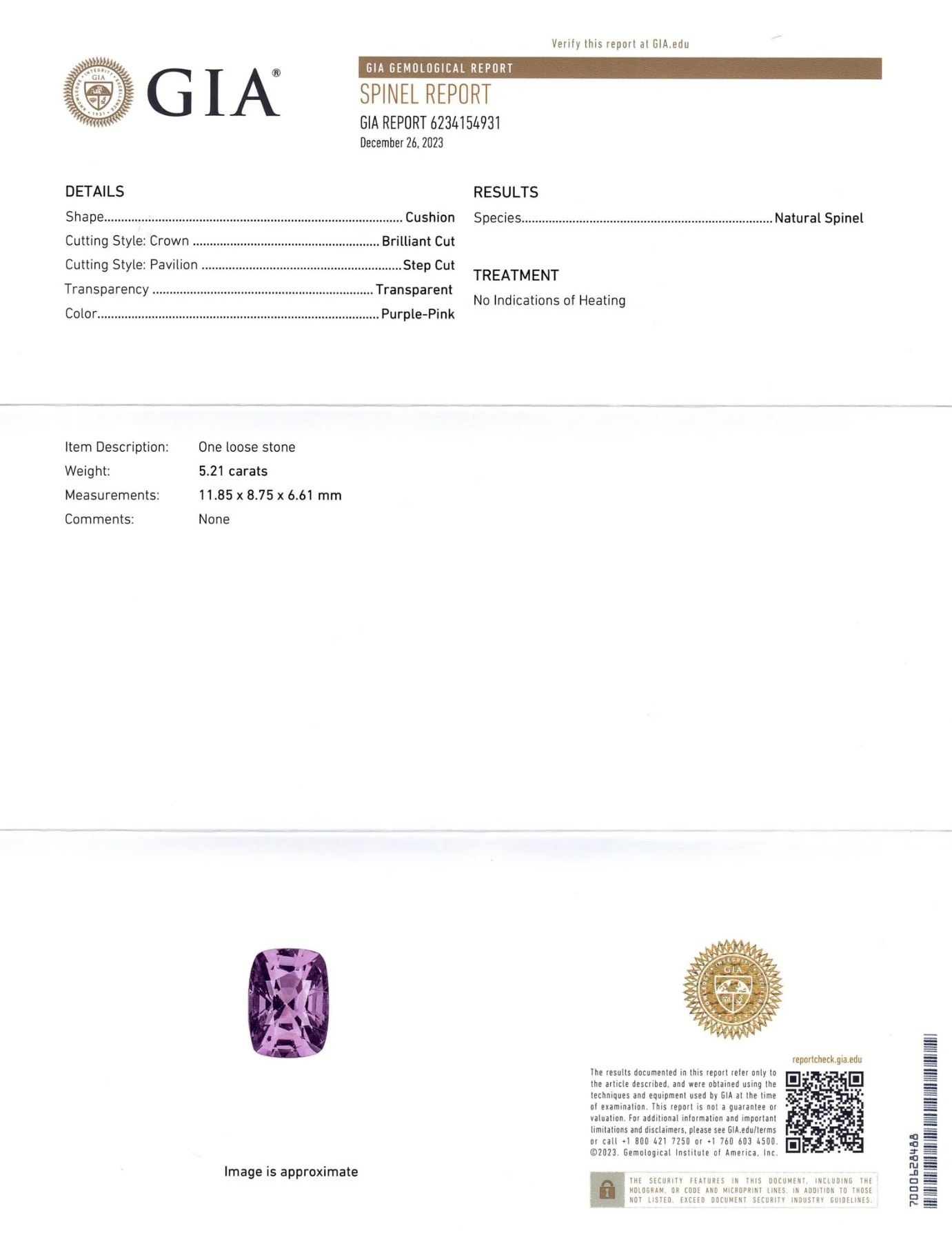 Huge 5.21 Ct Purple-Pink Spinel is a cushion brilliant cut measuring 11.85 x 8.75 x 6.61 mm. Reveals a gorgeous hue with a medium light tone. Absolutely stunning! Treatment: None. Please see the certification for additional information.