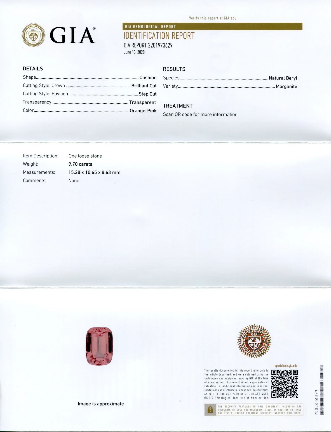 Huge VVS1 Eye Clean 9.70 Ct Orange-Pink Morganite measuring 15.28 x 10.65 x 8.63 mm with a brilliant cushion cut. It's unique color and hue would make this morganite a beautiful centerpiece. Origin: Brazil. Treatment: None. Please see the certification for additional information.