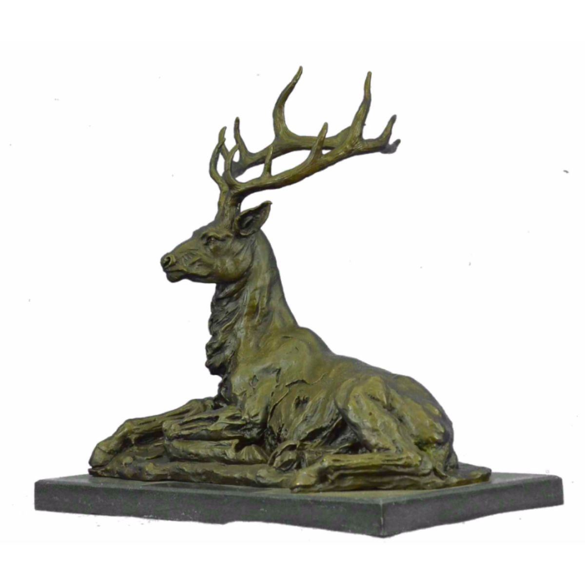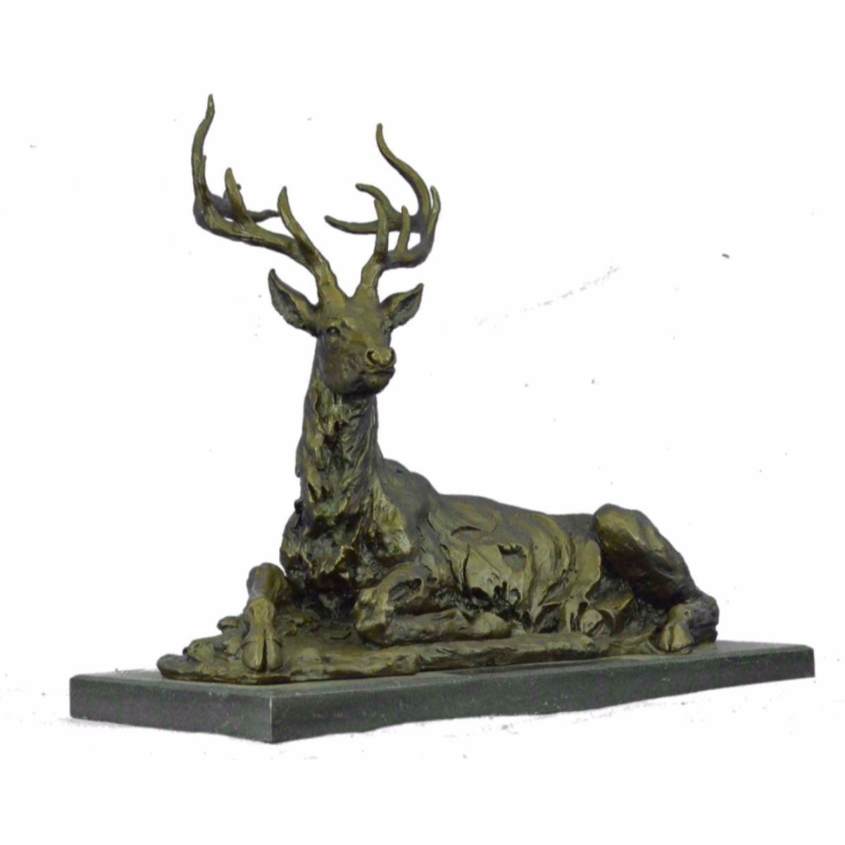 Large recumbent stag, deer lodge hunting cabin sculpture. Lost wax casting method bronze, with brown patina, mounted on marble base. 16" H X 18" W. 35lbs.Â