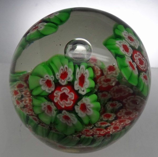 Large Red and Green glass paperweight made with Millefiori canes. Est Value $90-120.00