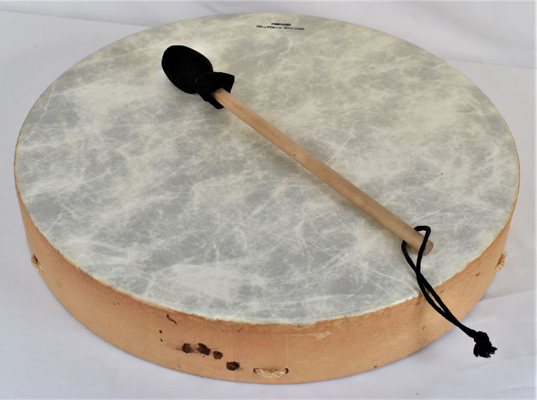 Large Remo Buffalo Drum, measures 22''D x 3.5''W, marked on the head of the drum, comes with mallet, drum head can be painted, FYI: ''Inspired by the indigenous cultures of the Americas, the Remo standard buffalo Drum is equipped with a rope handle and a single mallet. The Remo standard buffalo Drum is manufactured with Remo's Fiberskyn drumheads and patented Acoustic on drum shells for enhanced durability in any environment.''