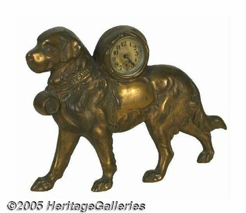 <B>Large Rescue Dog With "St. Bernard" on His Collar</B></I> Animals are popular subjects in the "character" clocks, and this is a beauty, with the ubiquitous cask of rum suspended under his chin. Dial stained, otherwise excellent shape. Clock runs and ticks, but we can't guarantee accuracy. A pre-1900 clock. Height 8 1/4", length 12". Lot:253