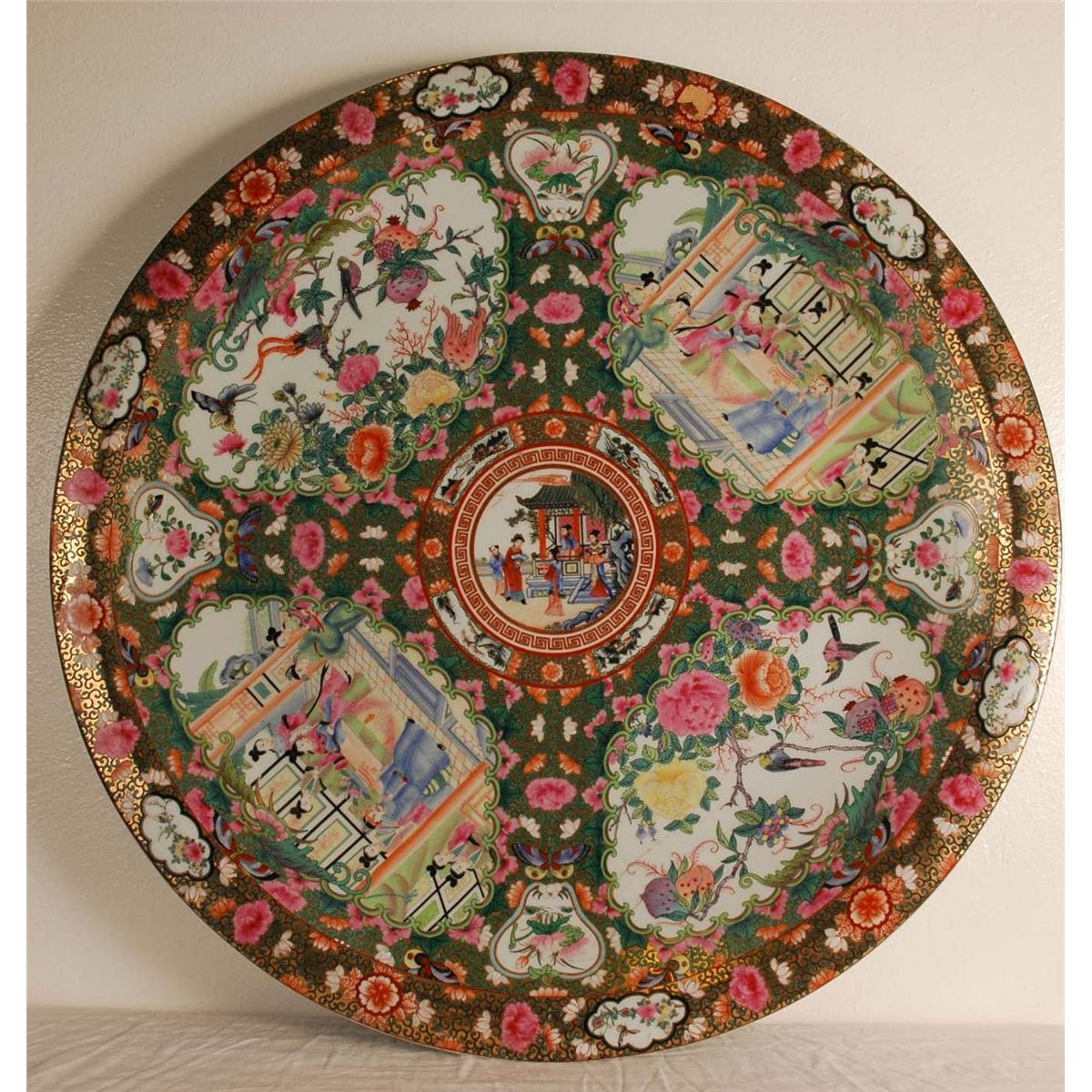 Rare large porcelain rose canton decorative plate with gold leaf accent. 30" Diameter circa 1980
