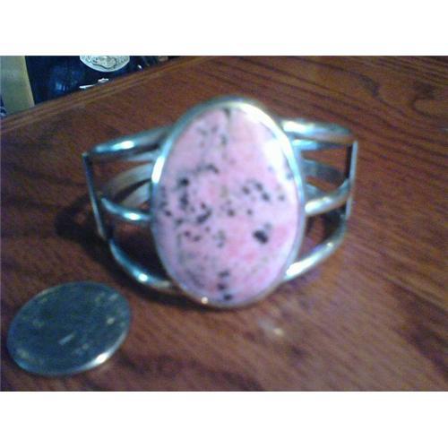 Large and VERY striking cuff bracelet-rose dalmation jasper(HOWLITE) setting measures 1 5/8 long by 1 1/4 wide/cuff opening measures 1 1/8 inches/measurement from inside cuff, from end to end measures 5 inches/Hallmarks illegable/tests pos for sterling/age and origin unknown.