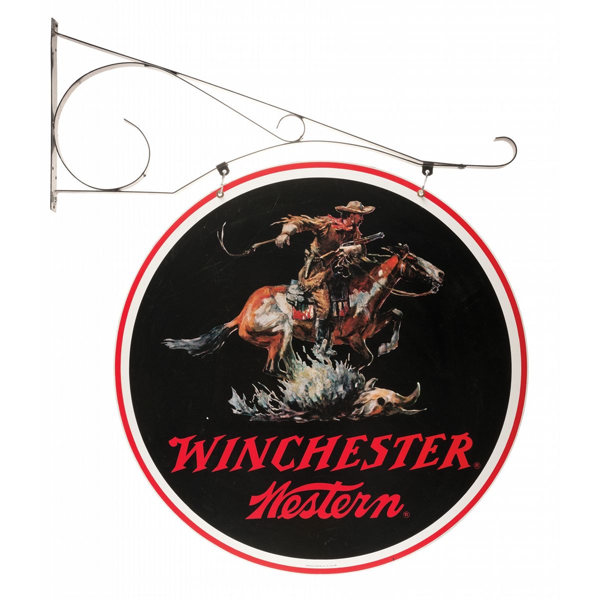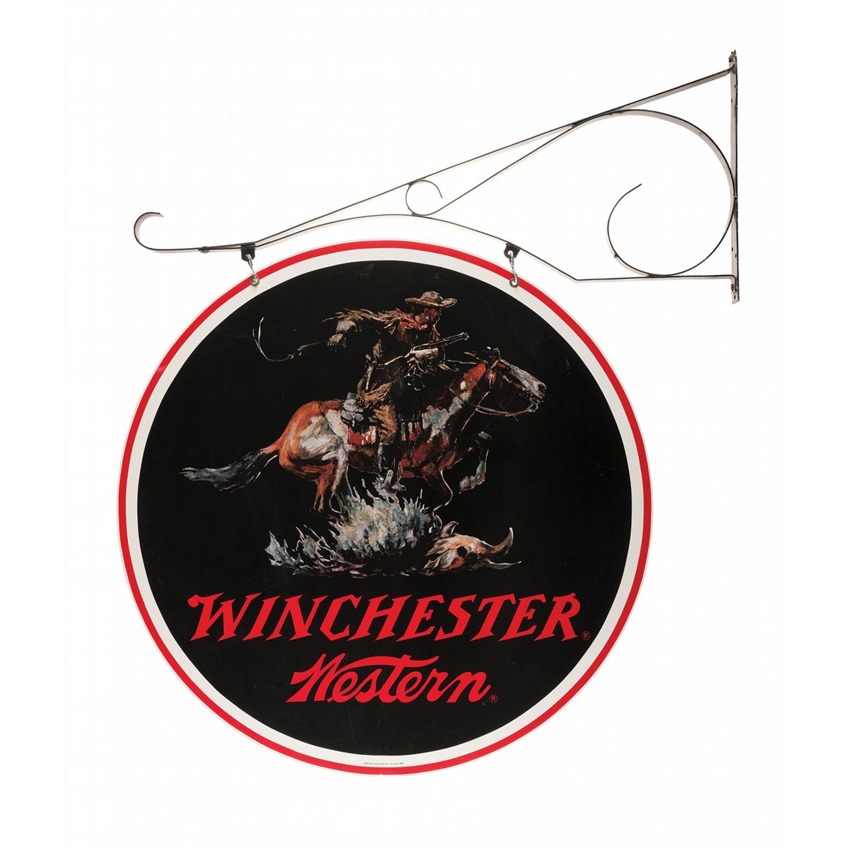 Large round 38" diameter Winchester-Western sign with the "Winchester Rider" logo, black background with red and white border, reading "WINCHESTER / Western" (both sides). Complete with a wrought iron wall bracket approximately 42" long.