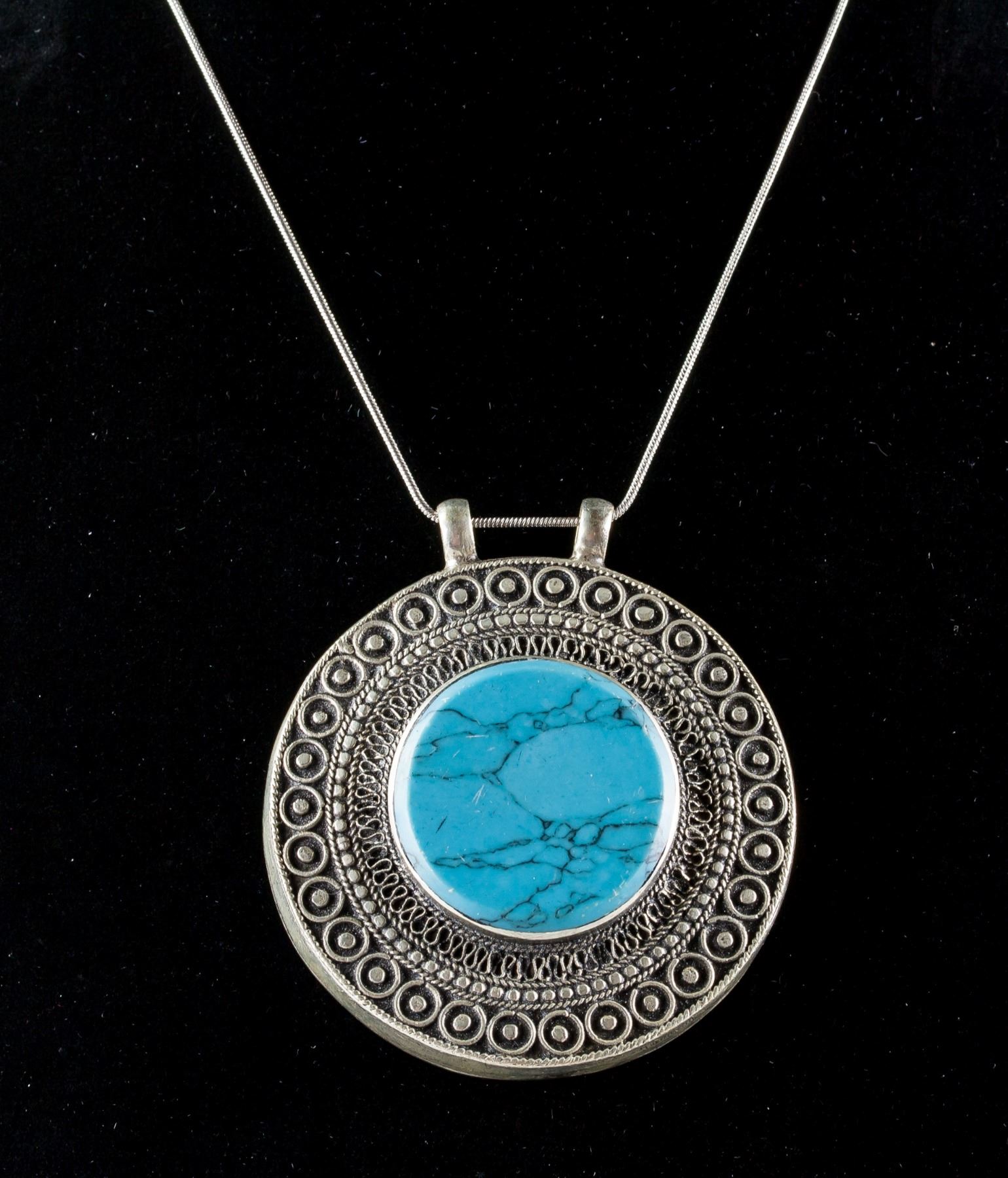 Stamped 925 silver necklace and pendant. Set with large round cut turquoise. 27 cm, 73 grams