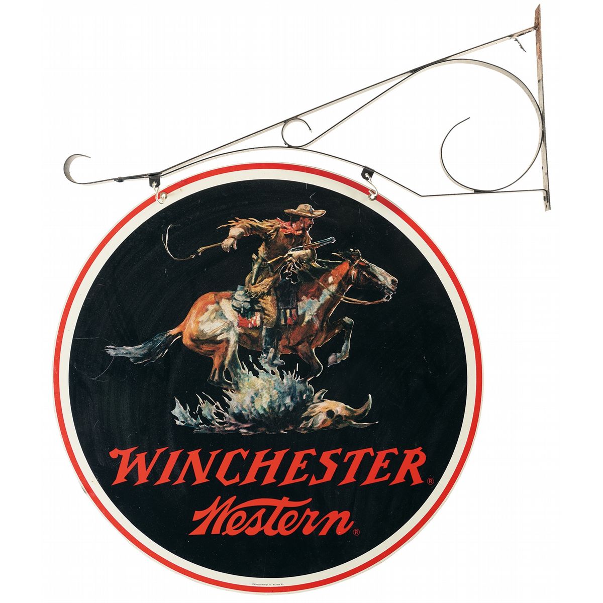 This 38 inch diameter round Winchester-Western sign has the "Winchester Rider" logo on a black background with a red and white border. It is marked "WINCHESTER/Western" on both sides. Comes with a wrought iron wall bracket that is approximately 42 inches long.
