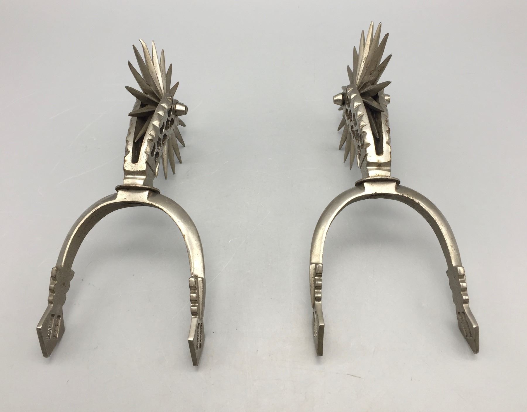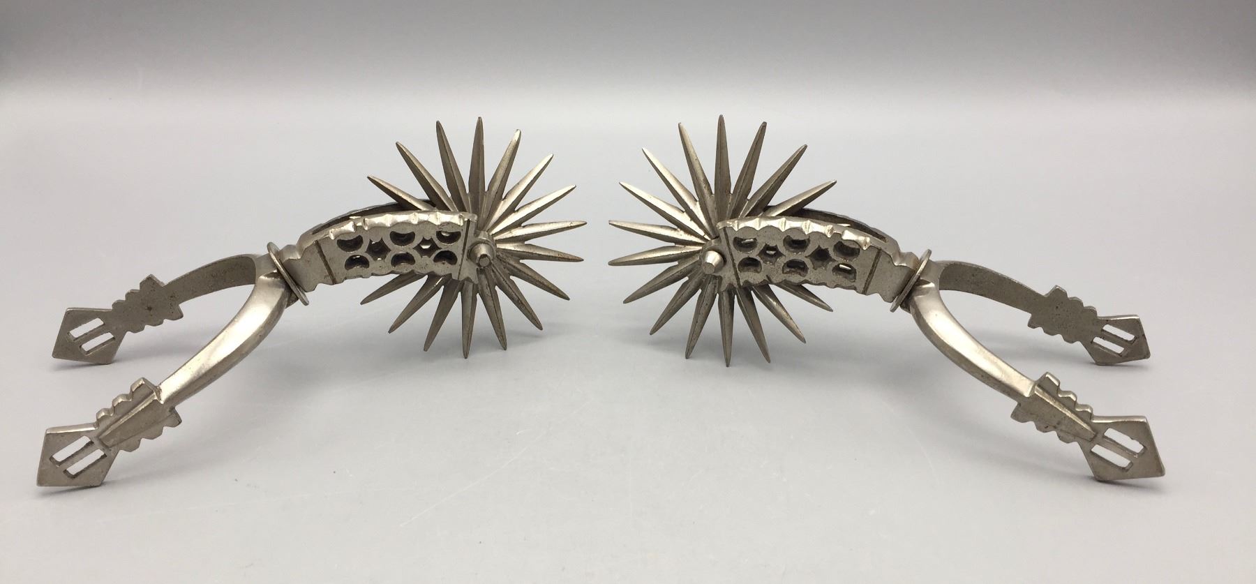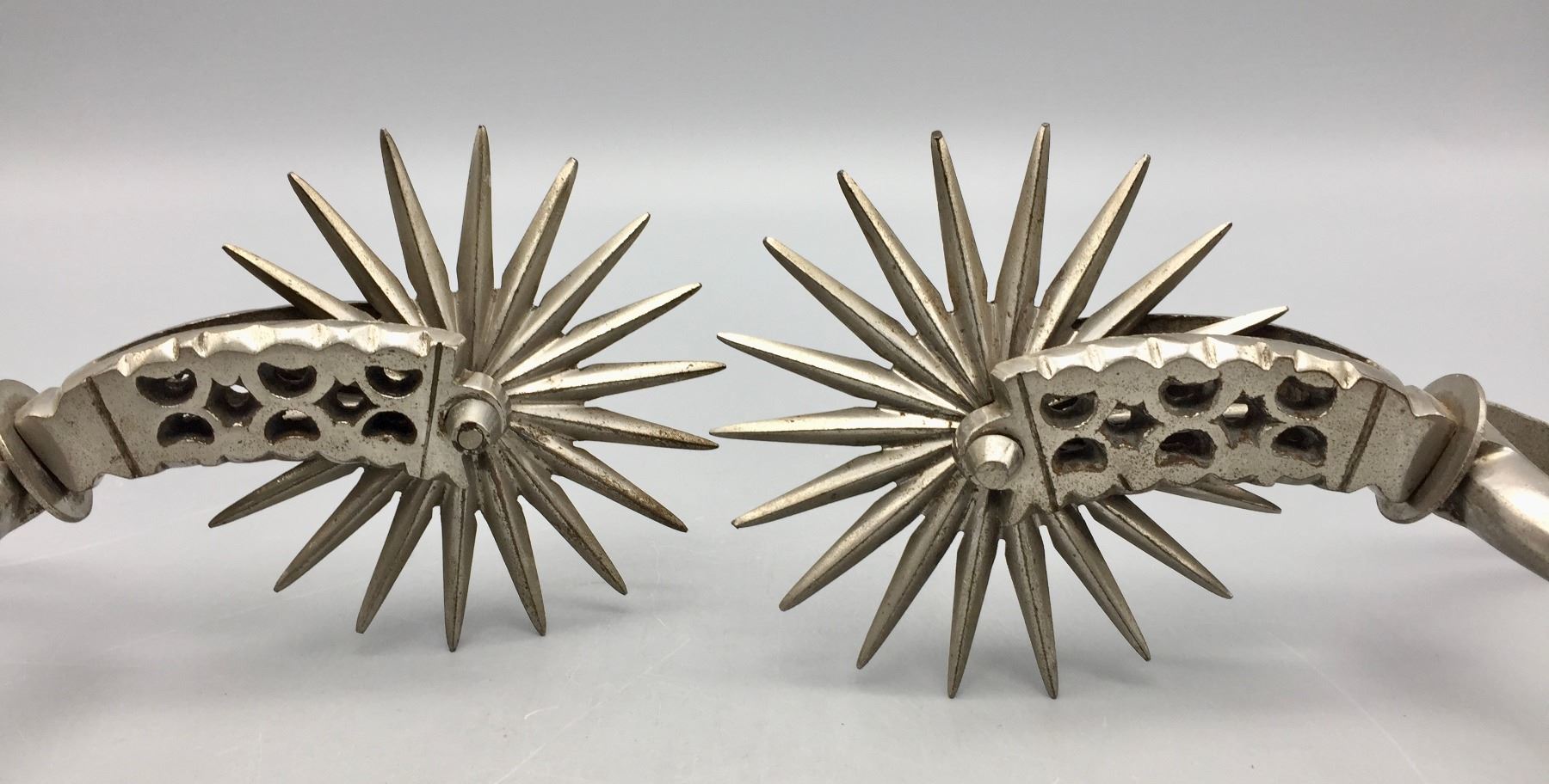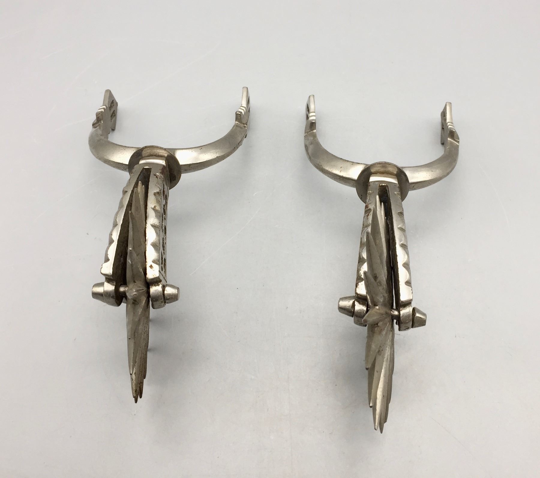 Description: For sale in this lot is a pair of Chilean spurs featuring ornate details and very large rowells. Maker: Unknown. Approx. Age: Vintage. Size: Heel measures 3”, shank measures 4-1/2”. Condition: Good for their age, normal wear expected. Please look closely at the pictures - they are an important part of our description. Shipping: There will be a $5 handling / packaging fee for shipping this lot. The actual cost of postage will be added on top of that.