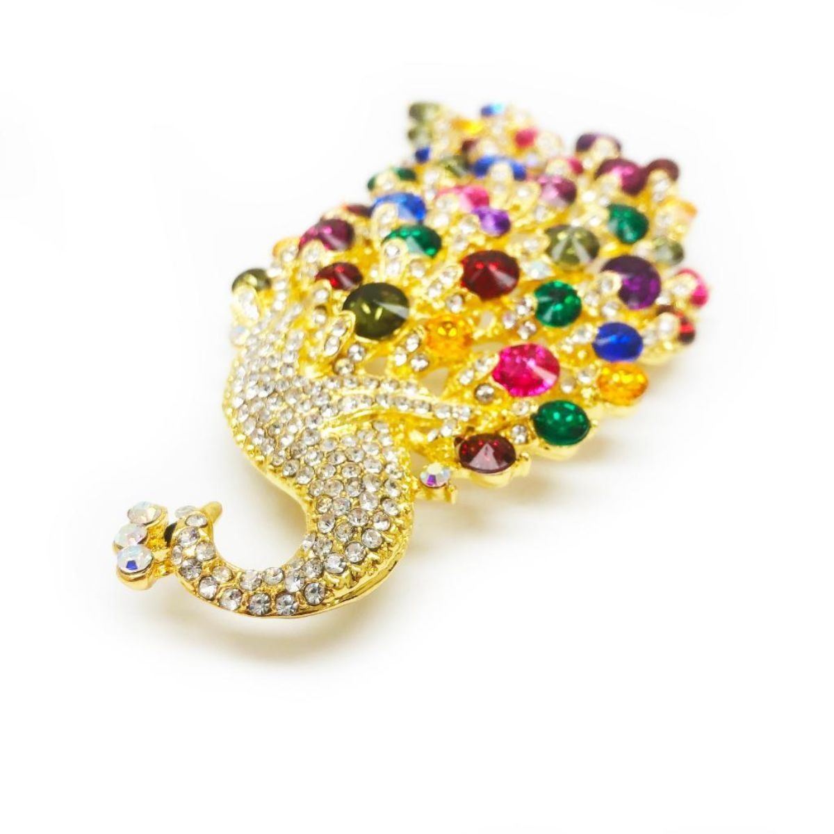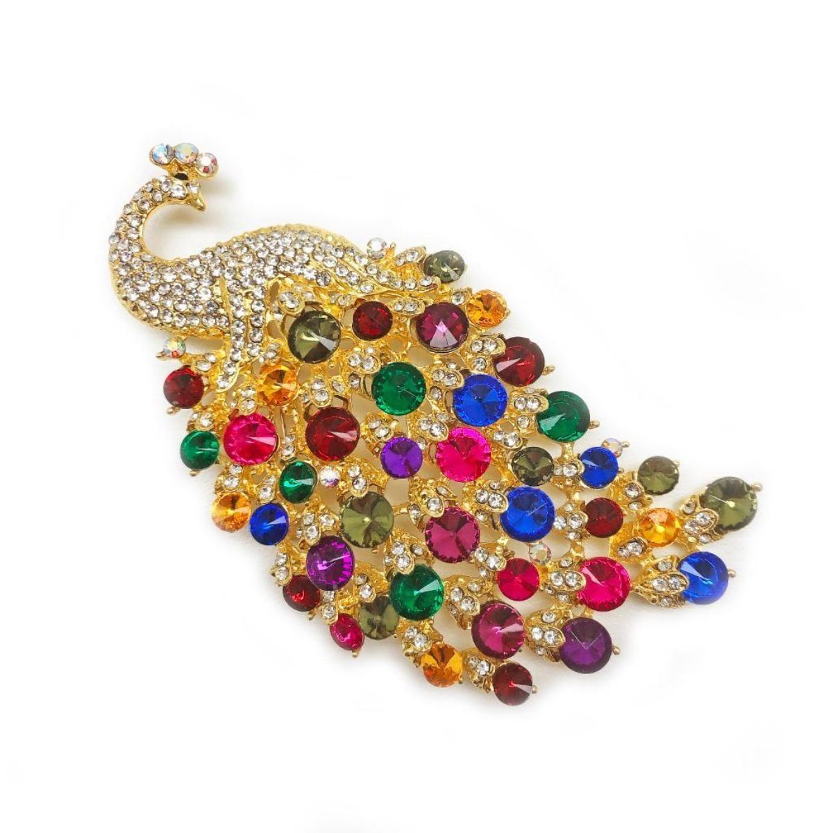 Large Royal Multi-Color Jewel Peacock Broach. That Has Over 75+ Glimmering Crystals. The Broach Is Supported By A Safety Lock Pin On The Back. Height: 6cm View Photos For Further Details.