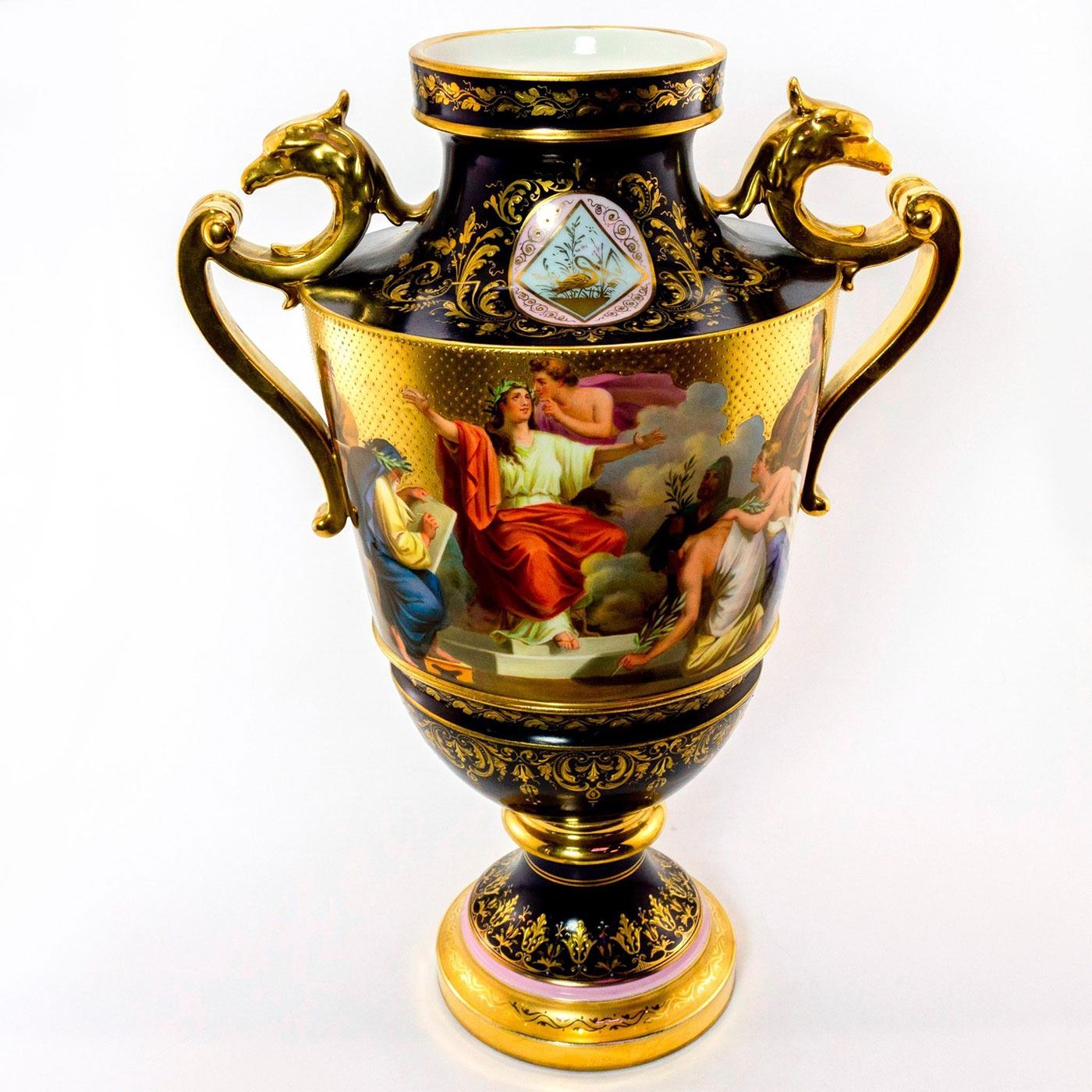 Impressive highly detailed porcelain footed vase; deep blue coloration with extensive gilding. Ornate urn with encircling painted classical scene. Finely crafted eagle-heads twin handles. Exquisitely designed with gold gilt and enamel; floral and raised beaded designs. Royal Vienna beehive backstamp. Age related wear.