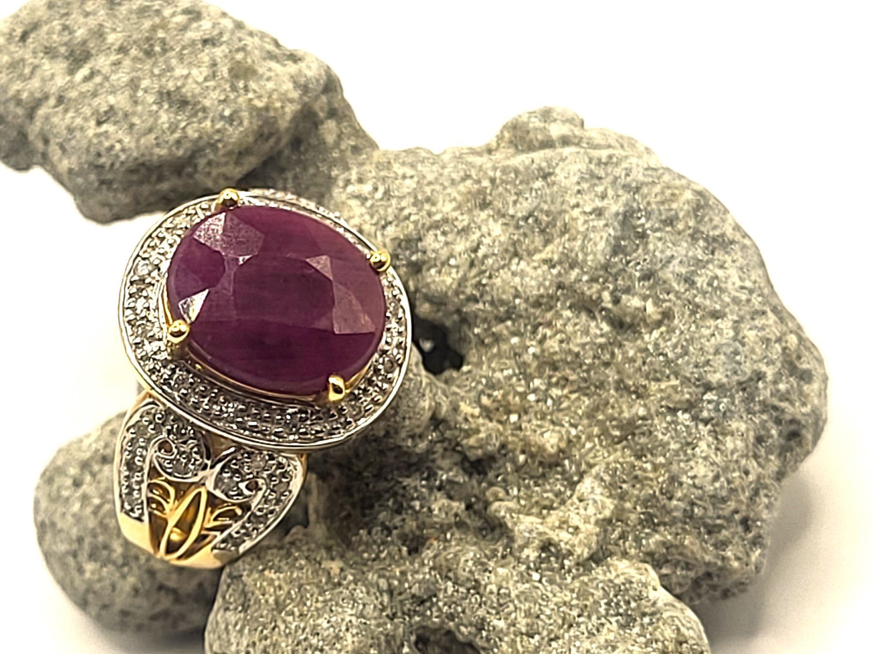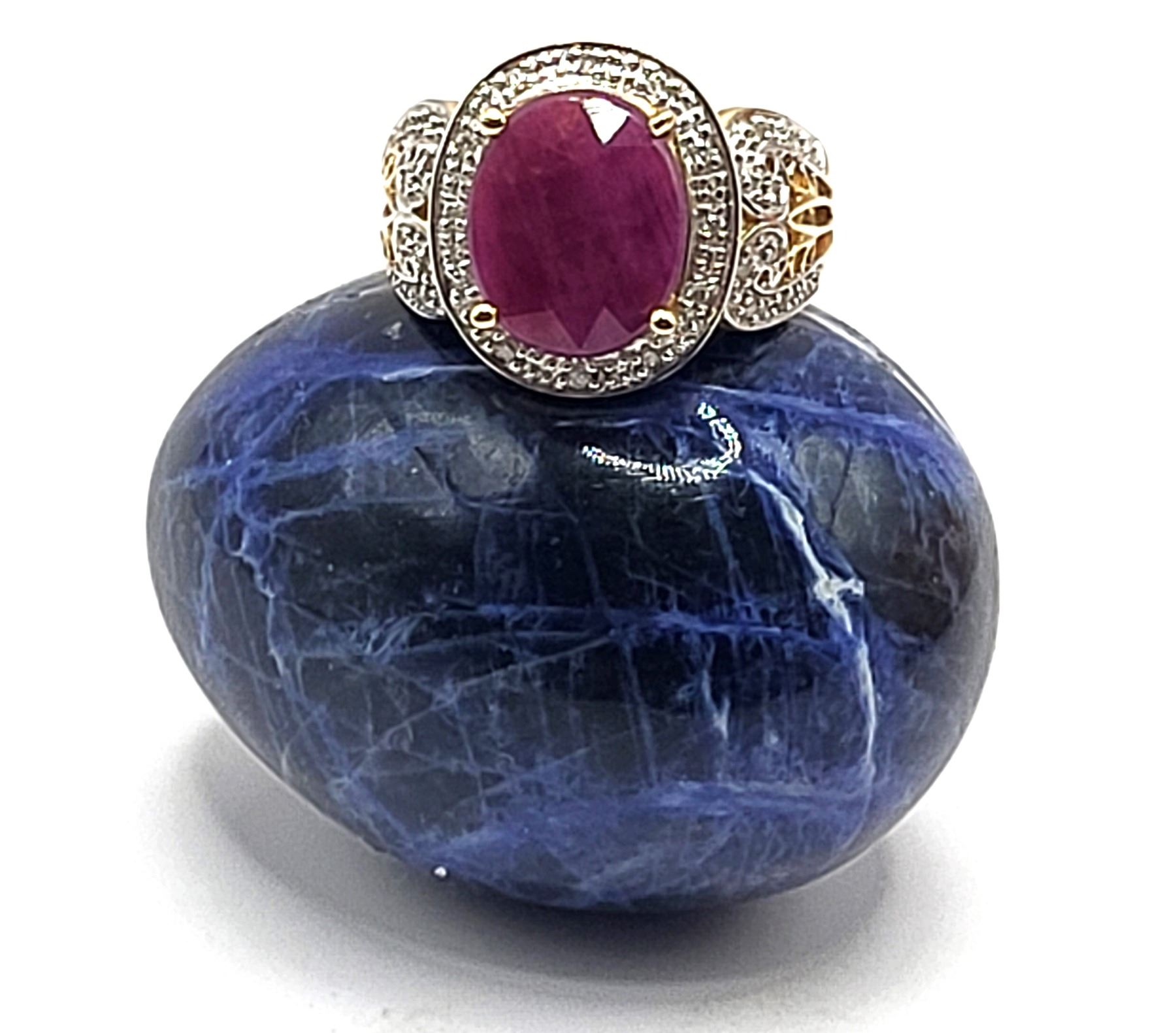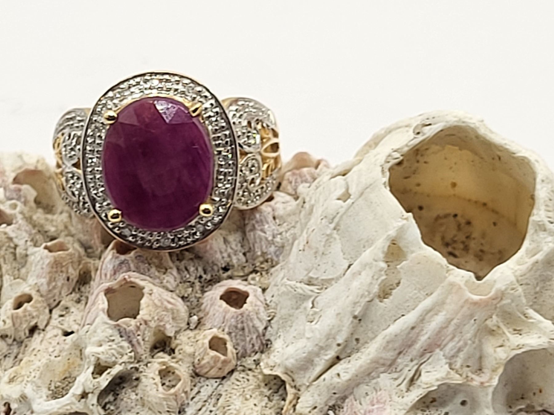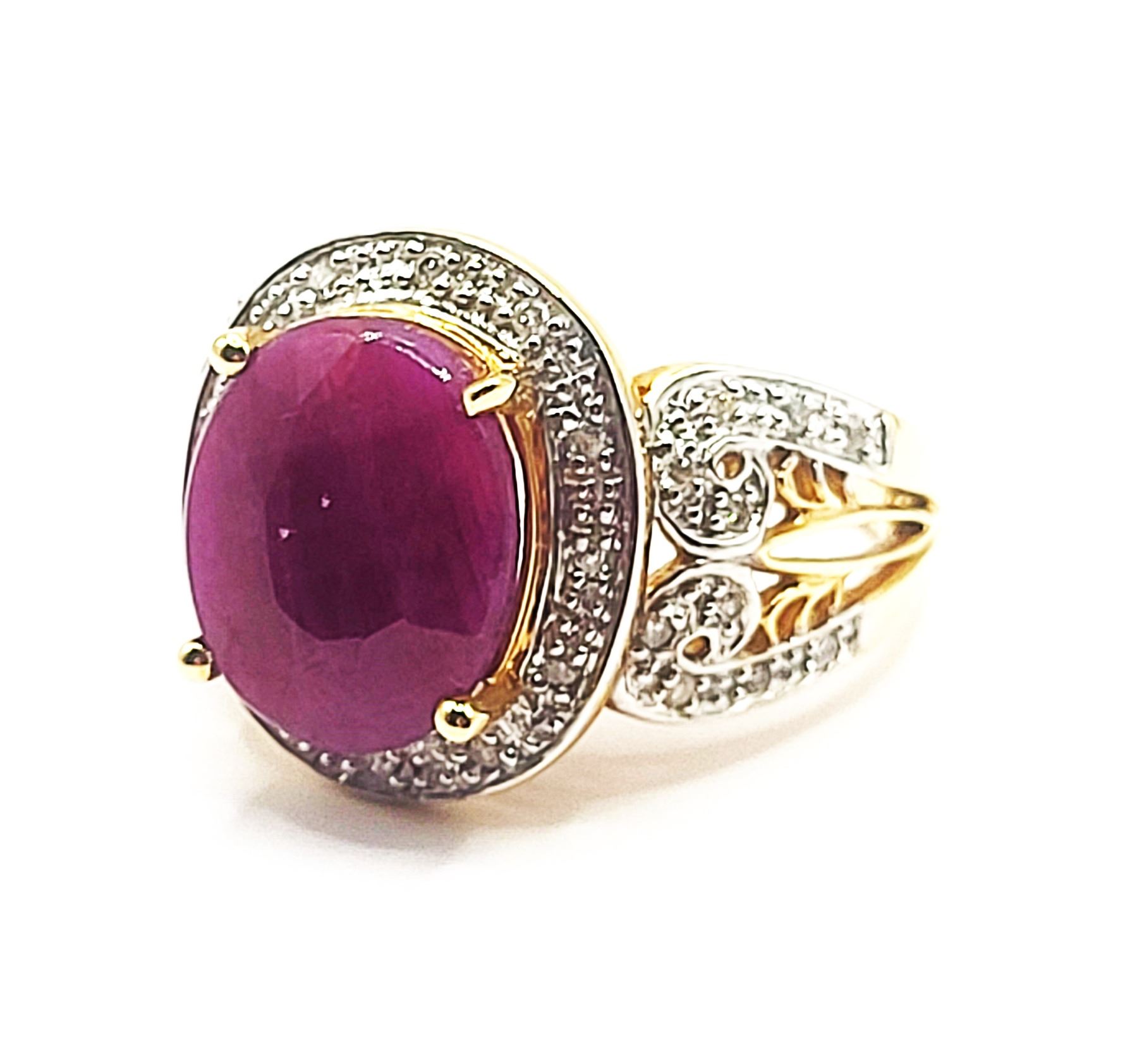 This is a 14 karat yellow gold ring with an approximate 5.00 carat, oval-cut, prong-set, genuine ruby (treated*) and approximately .25 carat total weight of round, faceted, H-I color, I1 clarity diamonds.& nbsp; This ring is US size 7.25 and can be sized for an additional charge. Please contact Bidfair Fine Jewelry for sizing details.& nbsp;