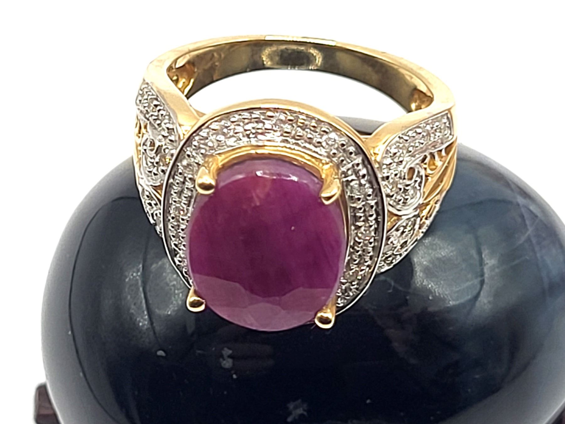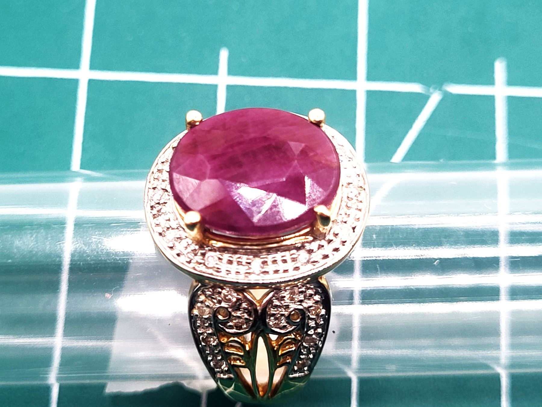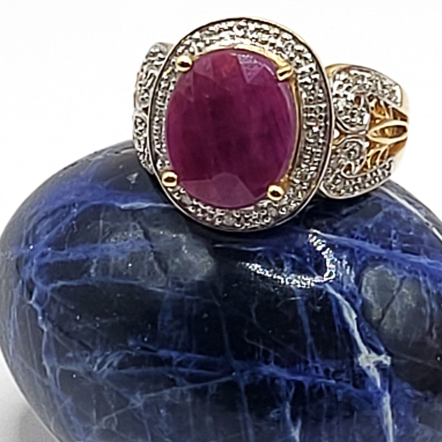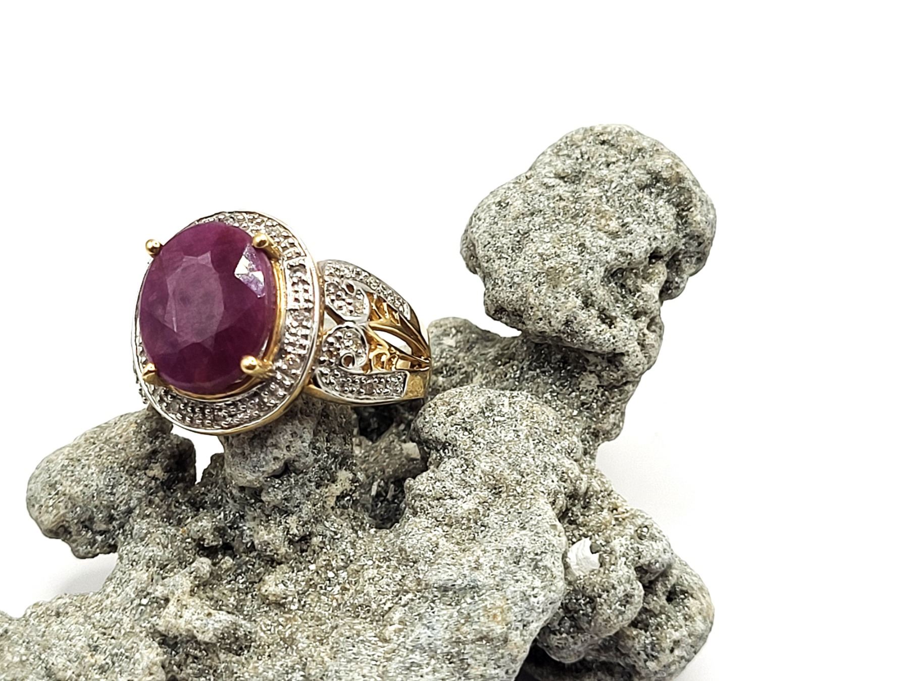 This is a 14 karat yellow gold ring with an approximate 5.00 carat, oval-cut, prong-set, genuine ruby (treated*) and approximately .25 carat total weight of round, faceted, H-I color, I1 clarity diamonds.& nbsp; This ring is US size 7.25 and can be sized for an additional charge. Please contact Bidfair Fine Jewelry for sizing details.& nbsp;