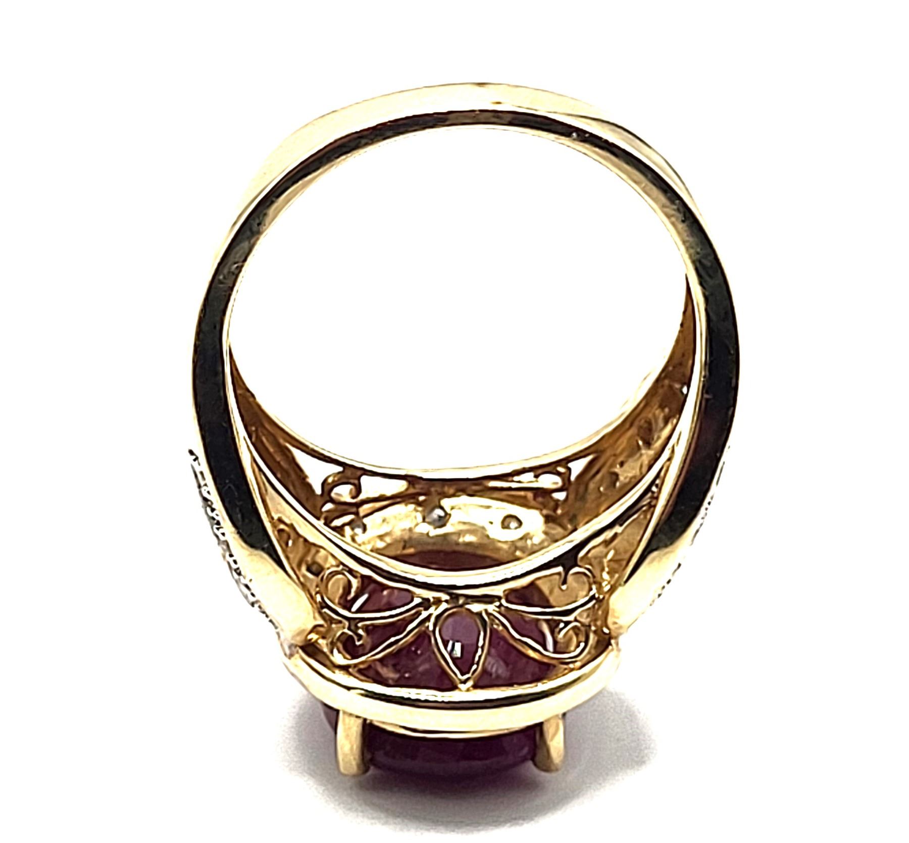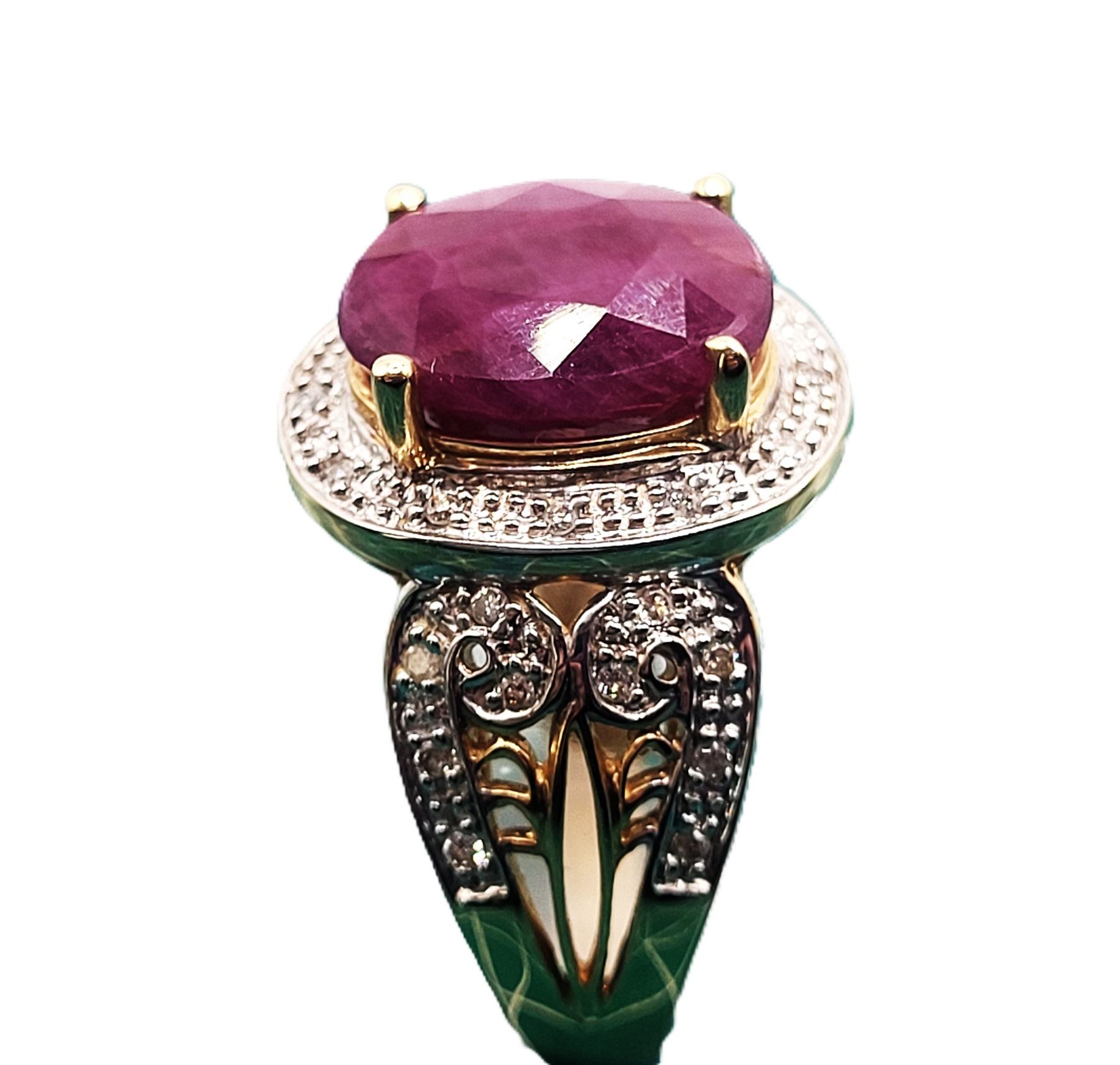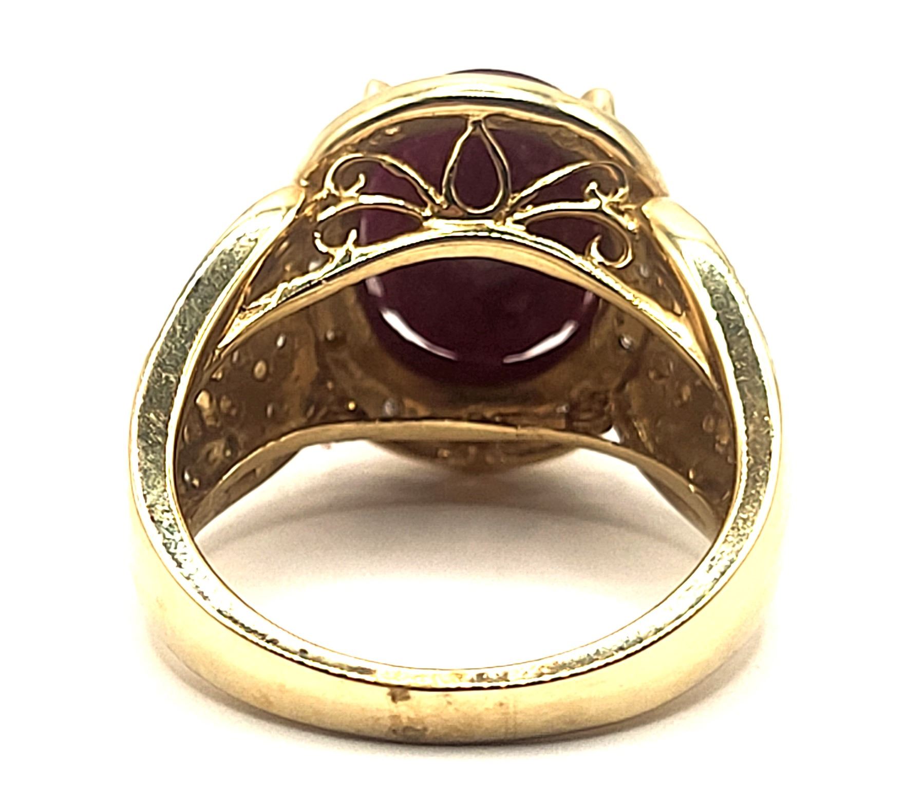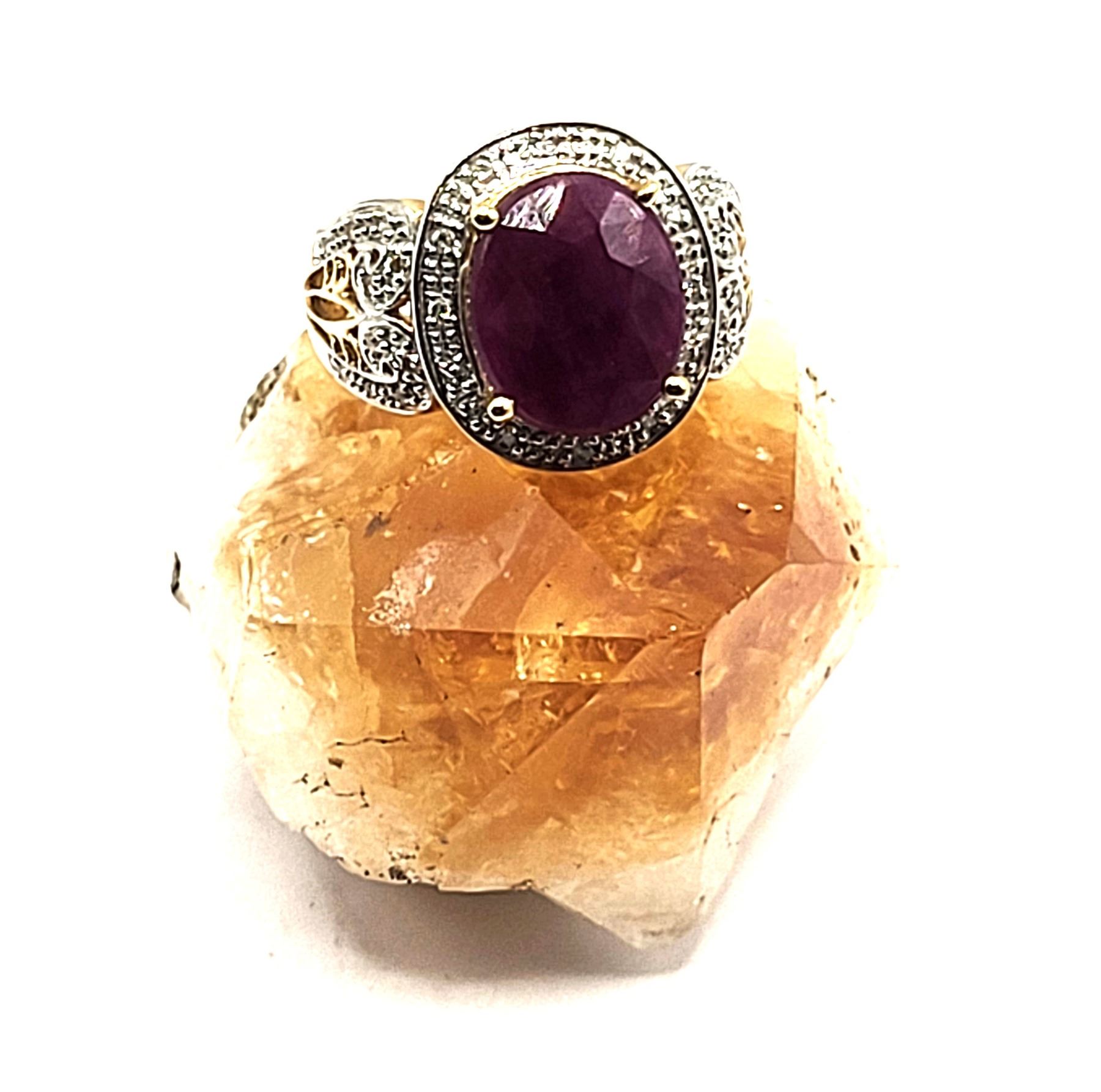 This is a 14 karat yellow gold ring with an approximate 5.00 carat, oval-cut, prong-set, genuine ruby (treated*) and approximately .25 carat total weight of round, faceted, H-I color, I1 clarity diamonds.& nbsp; This ring is US size 7.25 and can be sized for an additional charge. Please contact Bidfair Fine Jewelry for sizing details.& nbsp;