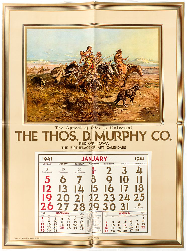 1941 This is a large wall hanging calendar from 1941 with a Charles Russell print "On the Move." - HKA#65939