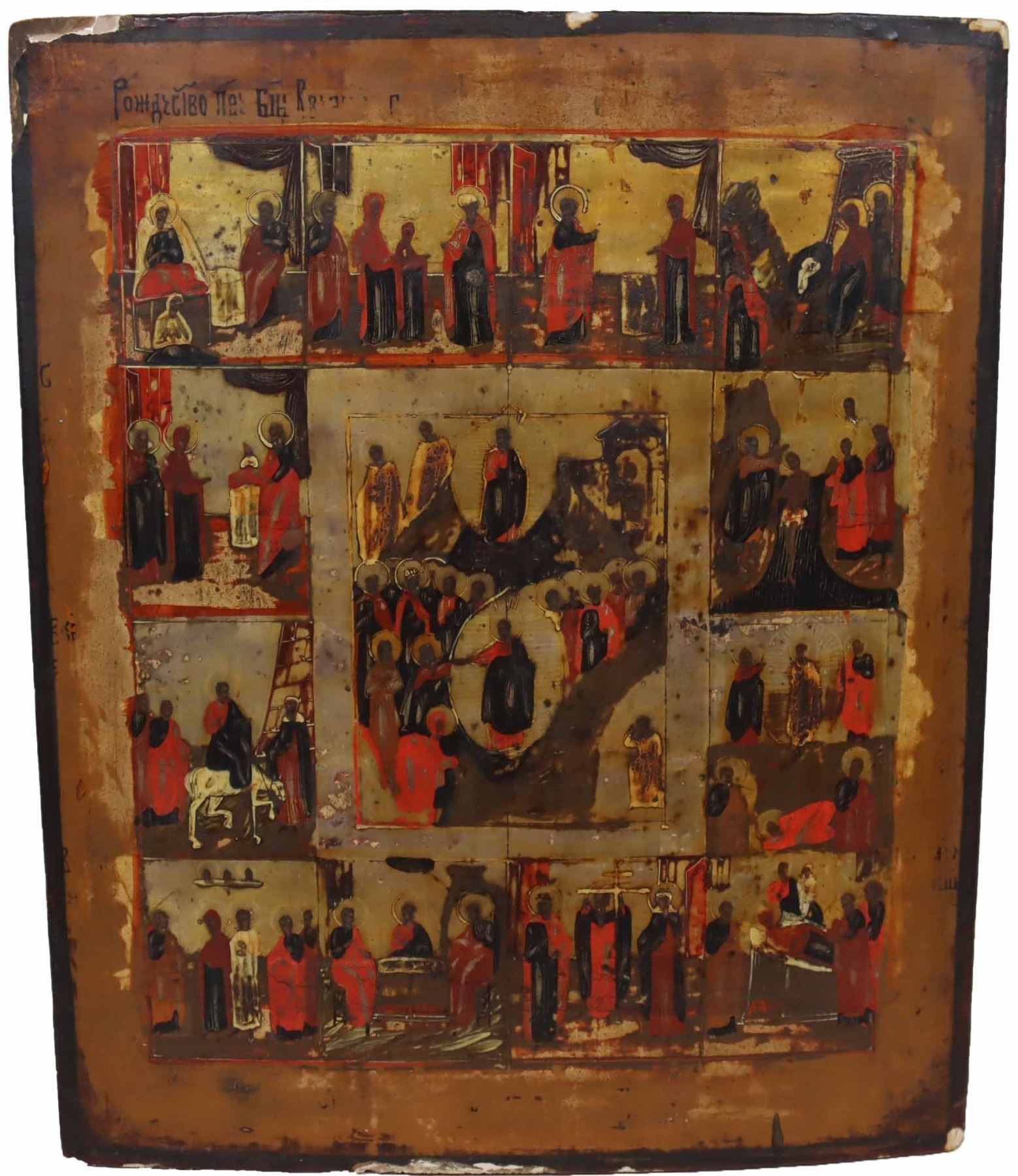 Gorgeous authentic Russian icon, of several holiday scenes, meticulously depicting various aspects of the nativity. Beautifully painted in red and ocre with egg tempera, gold and silver leaf details, set on a gesso wood panel.