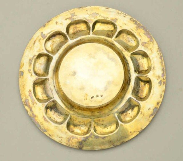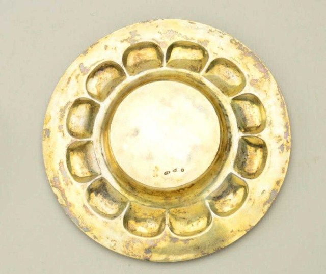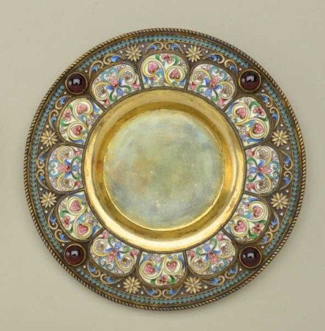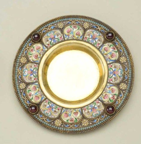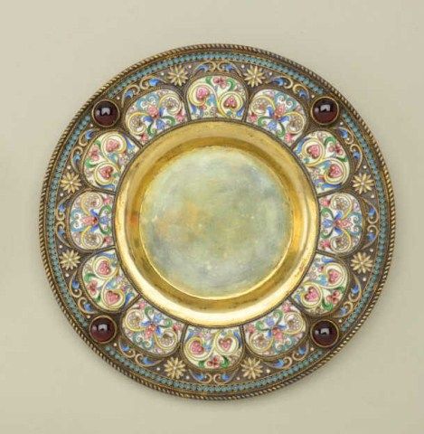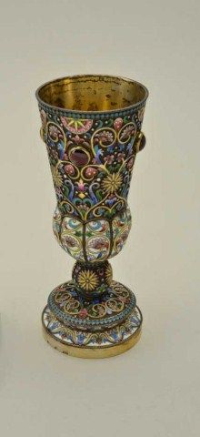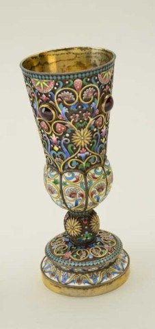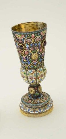 Large Russian gilt on silver and enamel decorated toasting cup with matching tray showing jeweled accents. The cup measures 6-1/2” in height the tray measures nearly 5” across the center. The tray shows hallmarkson reverse MC in oval H&K/1882, 84 in square probably silver content with St. George slaying dragon in small square hallmark. The enamel is in multi colors in fine condition with jeweled accents and there is an eagle in the center of the tray. Condition is fine to near excellent. The interior of the cup shows some staining to the gilt. Est.;$5,000-$10,000.