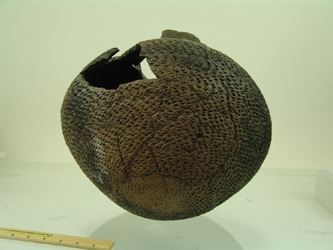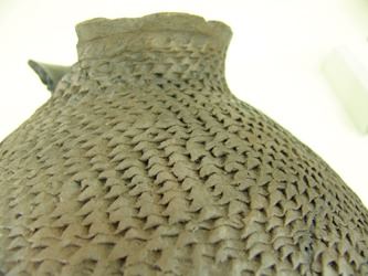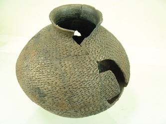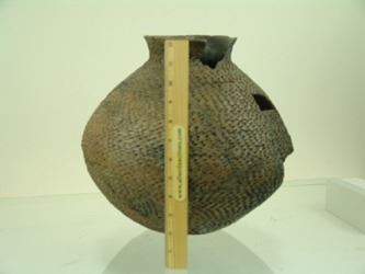 Wonderful, larger sized olla with heavily corrugated exterior, and excellent patina. This big beauty has been glued together, but not fully restored, and appears to be about 80% complete. Prehistoric. 13" x 14"